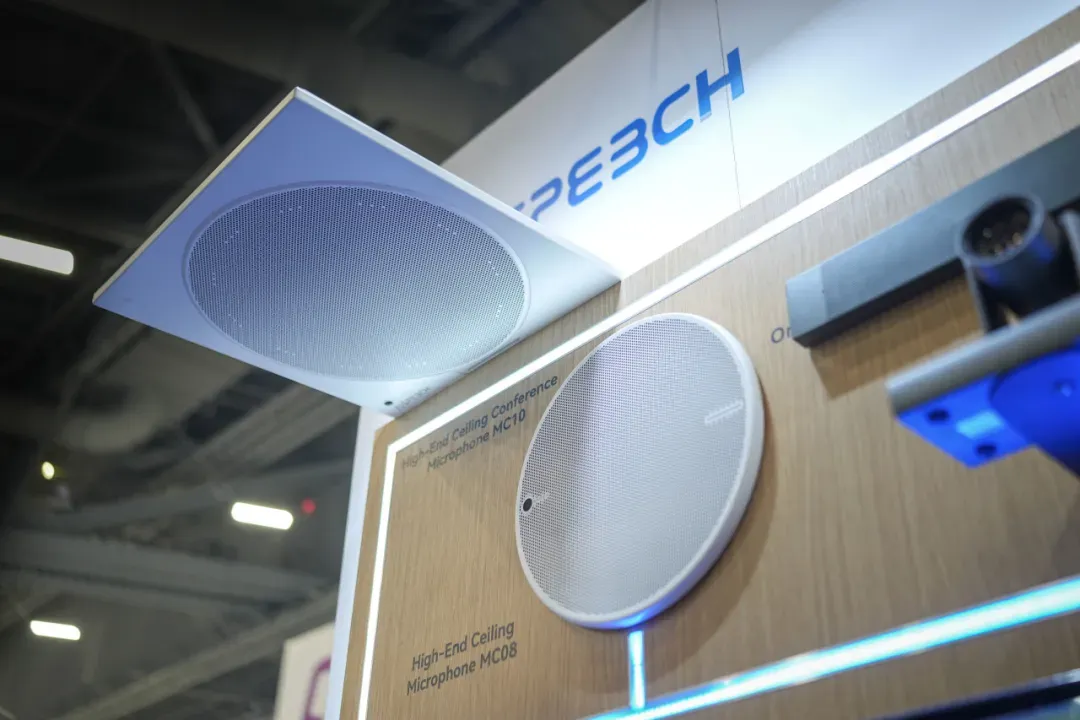 现场还展示了思必驰在智慧办公场景中的应用,AI办公本在嘈杂环境下的表现,其智能拾音、降噪与实时转写功能吸引了众多关注。而吸顶麦克风独特的无感扩声技术,具有更大的扩音音量和更清晰的音质,让远程协作再无距离障碍。