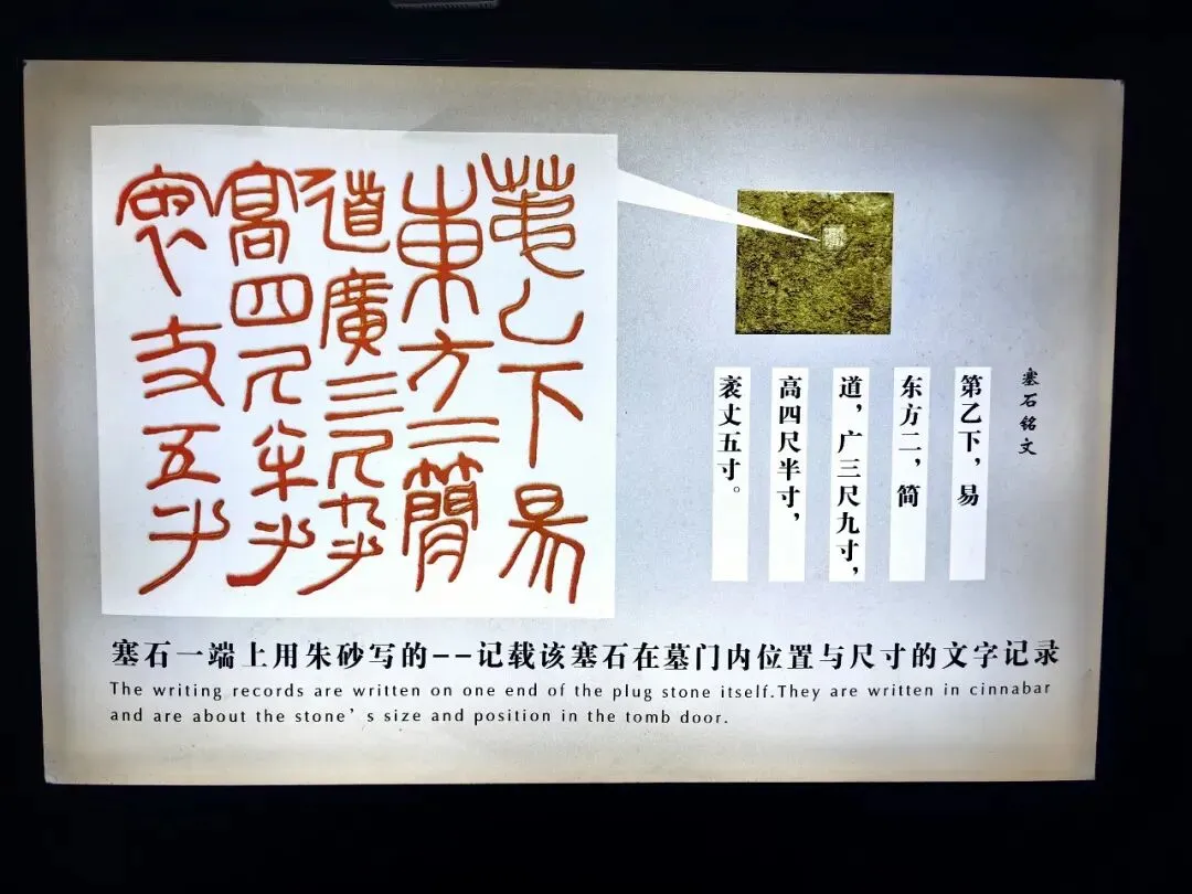 值得留意的是,清理完塞石以后,专家们发现,在【塞石】的一端上,还有用朱砂写成的字,大概意思就是用来标明每块【塞石】的尺寸,以及应该放的位置。