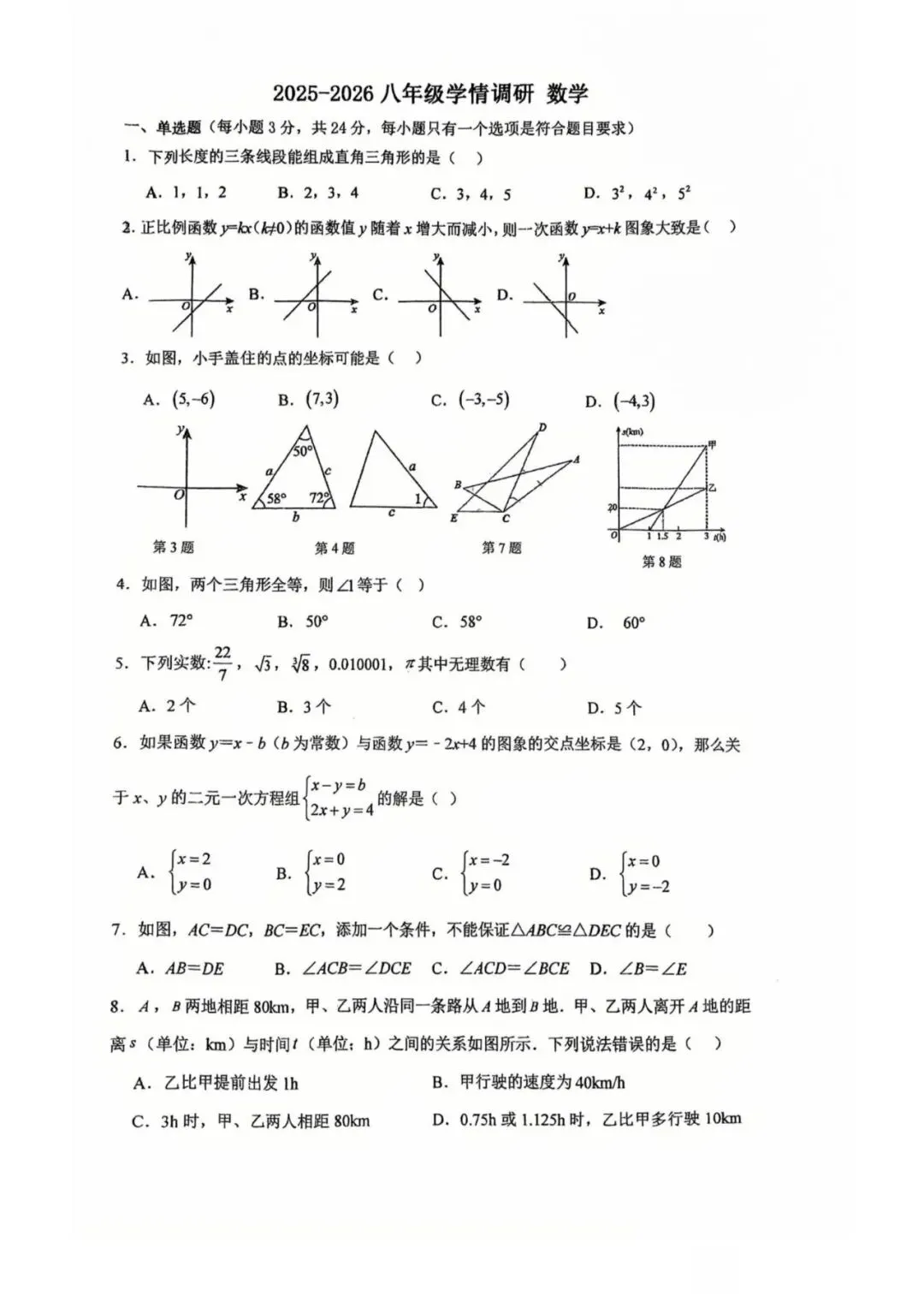 本卷突出数学基础能力的系统考查,选择题以直角三角形判定、函数图像分析、坐标判断、全等三角形证明等题目考查基础概念理解,非选择题通过实际应用、几何证明、函数求解等综合题考查知识迁移能力。难点在于第8题行程问题需掌握函数图像分析技巧,第16题动点问题要求理解分类讨论思想,对空间想象能力要求较高;第7题全等判定考查逻辑推理,第24题存在性问题涉及综合探究。易得分题多为直接计算题,但整体通过生活情境题显著提升应用价值,符合八年级数学1月月考的素养要求。