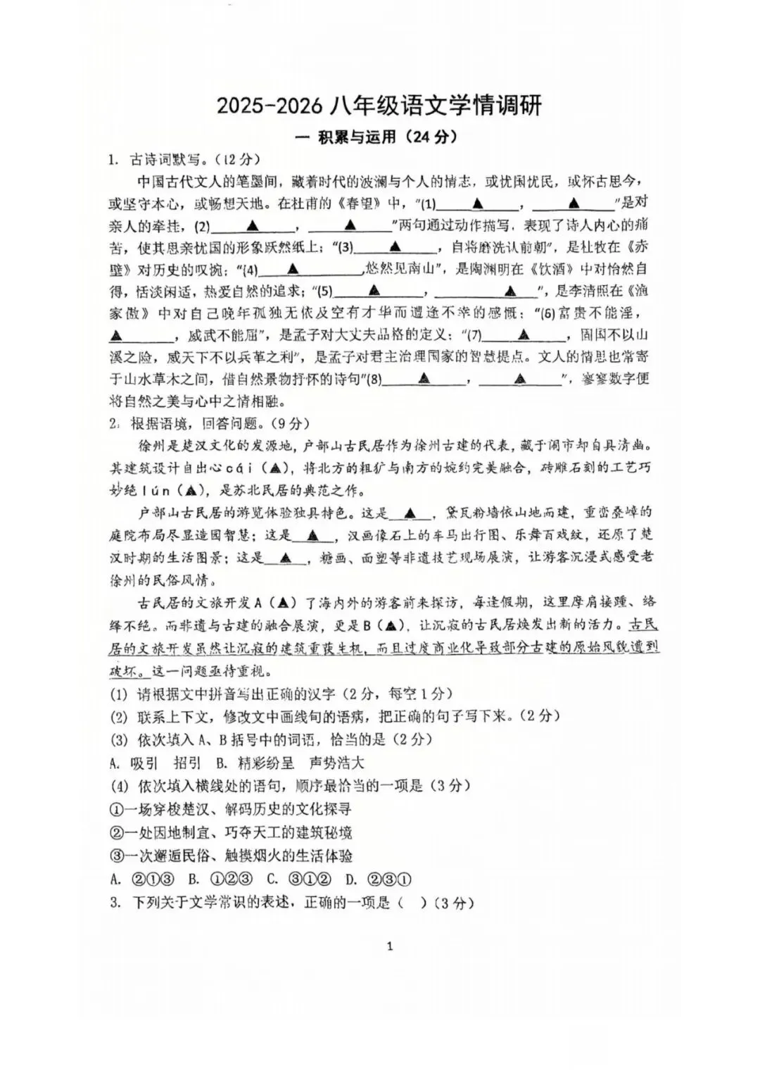 本卷突出语文素养的系统性考查,积累运用部分以徐州地域文化为素材考查传统文化理解,古诗文阅读通过《生于忧患,死于安乐》与《贞观政要》比较阅读考查文言功底。难点在于文言文断句与翻译需掌握语法规则,现代文阅读《收废品的老罗》要求理解人物形象塑造手法,对文本深层解读能力要求较高;名著阅读考查《红岩》人物精神理解,写作话题"接力"涉及时代精神传承。易得分题多为直接默写题,但整体通过综合性学习任务显著提升思维深度,符合八年级语文1月月考的素养要求。