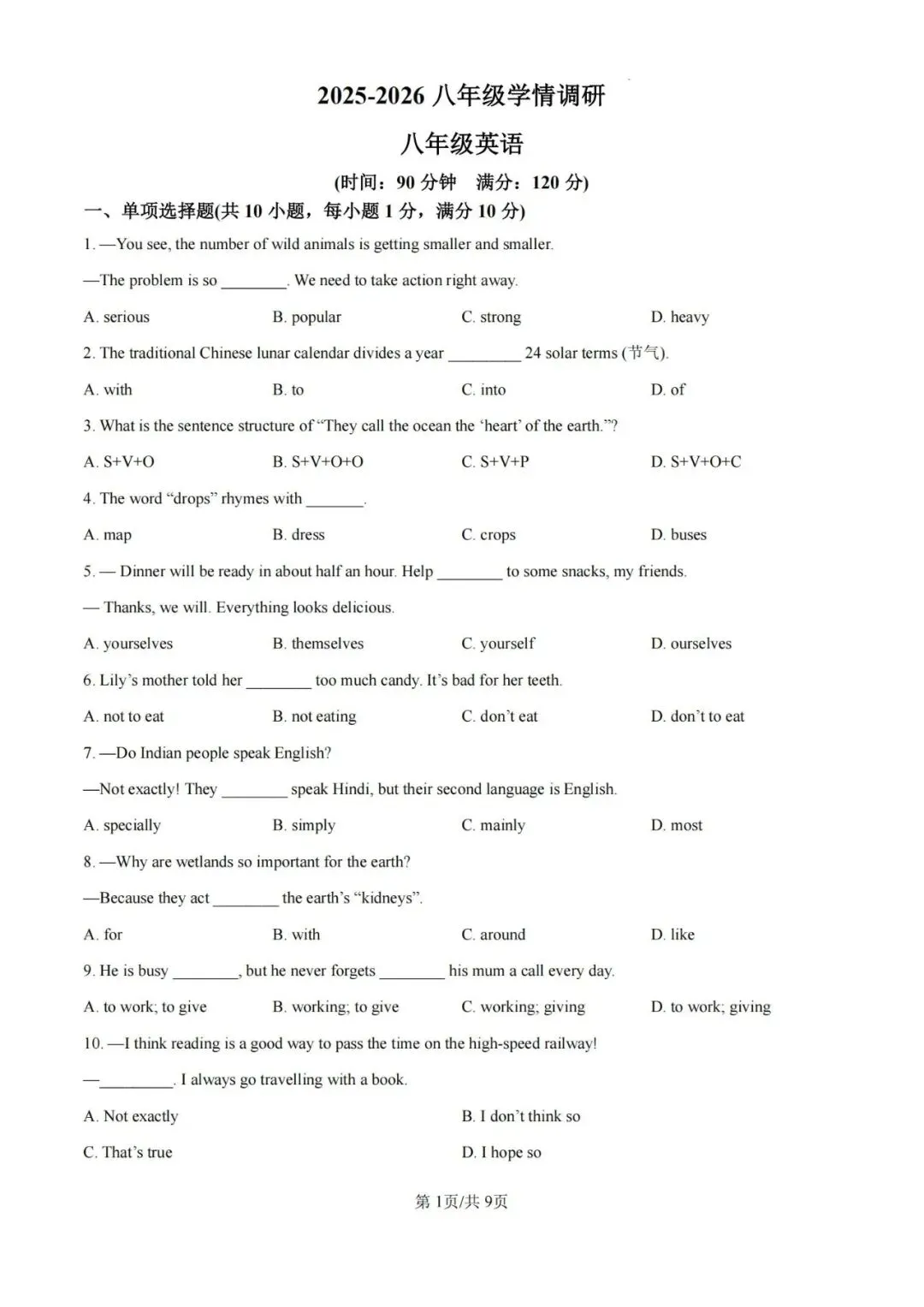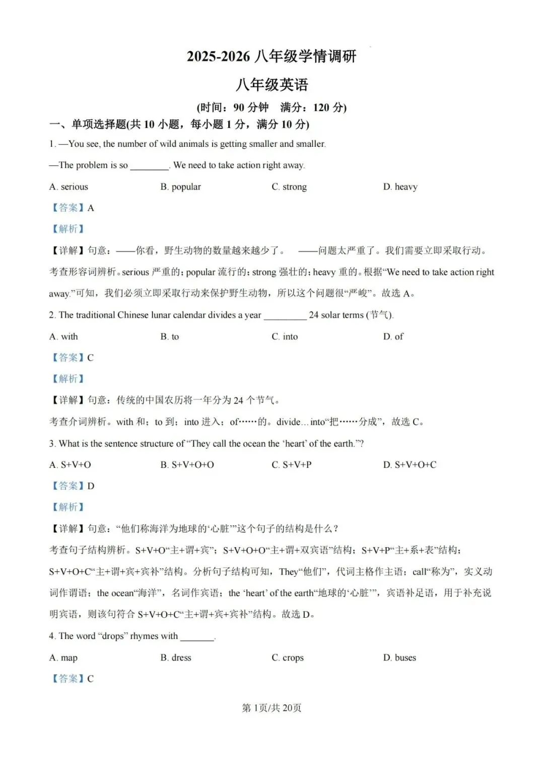 本卷突出英语基础能力的系统考查,单项选择题以野生动物保护、节气文化、句子结构、押韵词辨析等题目考查基础语言运用能力,完形填空通过猫头鹰迁徙保护的真实情境考查语境理解能力。难点在于D篇AI科技说明文需掌握学术文本解读技巧,书面表达建议信要求掌握正式文体格式,对逻辑表达能力要求较高;B篇海豚科普考查跨学科知识,C篇诗歌鉴赏涉及文学素养。易得分题多为直接信息匹配题,但整体通过科技前沿话题显著提升思维深度,符合八年级英语1月月考的素养要求。