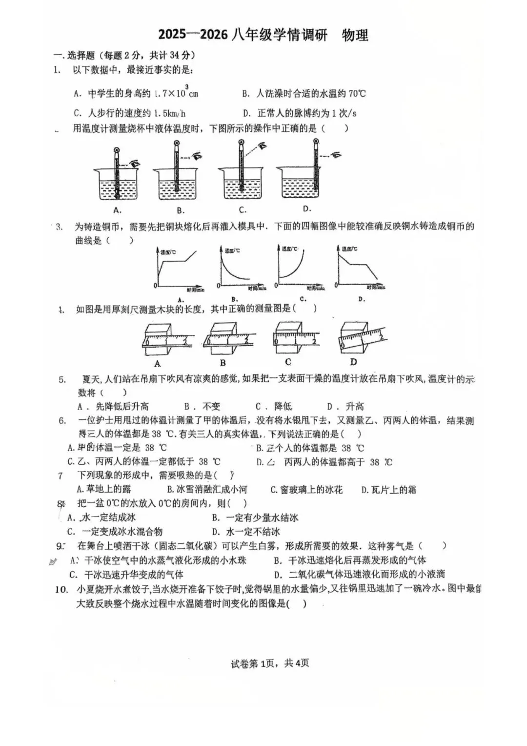 本卷突出物理学科基础性与实践性,选择题以温度计使用、物态变化判断、长度测量、参照物选择等生活化情境考查基础概念理解,非选择题通过冰熔化实验、水沸腾探究、纸锥下落比较等综合题考查实验探究能力。难点在于第17题百米赛跑问题需掌握相对运动原理,第23题频闪照片分析要求理解平均速度计算,对逻辑推理能力要求较高;第10题水温变化图像考查图像分析能力,第29题纸锥实验涉及控制变量法。易得分题多为直接现象判断题,但整体通过实验探究题显著提升科学素养,符合八年级物理1月月考的素养要求。