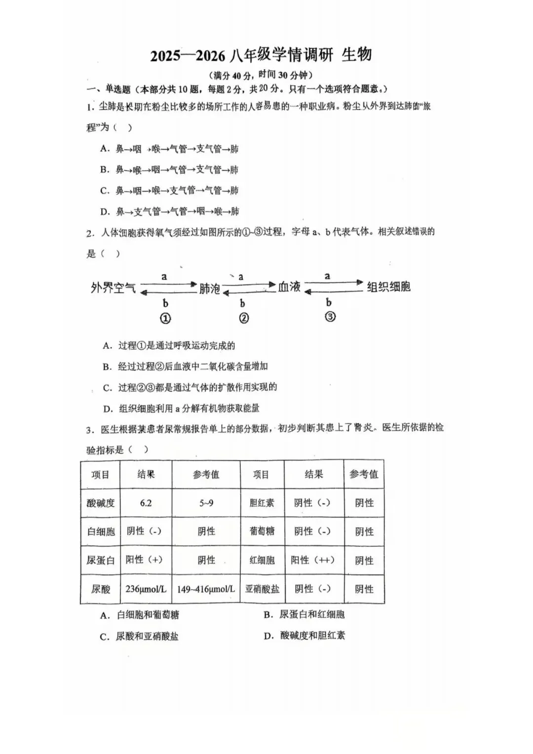 本卷突出生物学科基础性与实践性,选择题以尘肺病呼吸途径、气体交换过程、尿常规诊断、生长激素调节等生活化情境考查基础概念理解,非选择题通过海姆立克急救法、尿液形成过程、神经元结构等综合题考查知识应用能力。难点在于第2题气体交换需掌握肺泡毛细血管扩散原理,第4题血糖调节实验要求理解胰岛素功能,对实验分析能力要求较高;第8题神经元结构考查细胞特殊化,第11题呼吸急救涉及生理机制。易得分题多为直接概念判断题,但整体通过急救实践等真实情境题显著提升应用价值,符合八年级生物1月月考的素养要求。