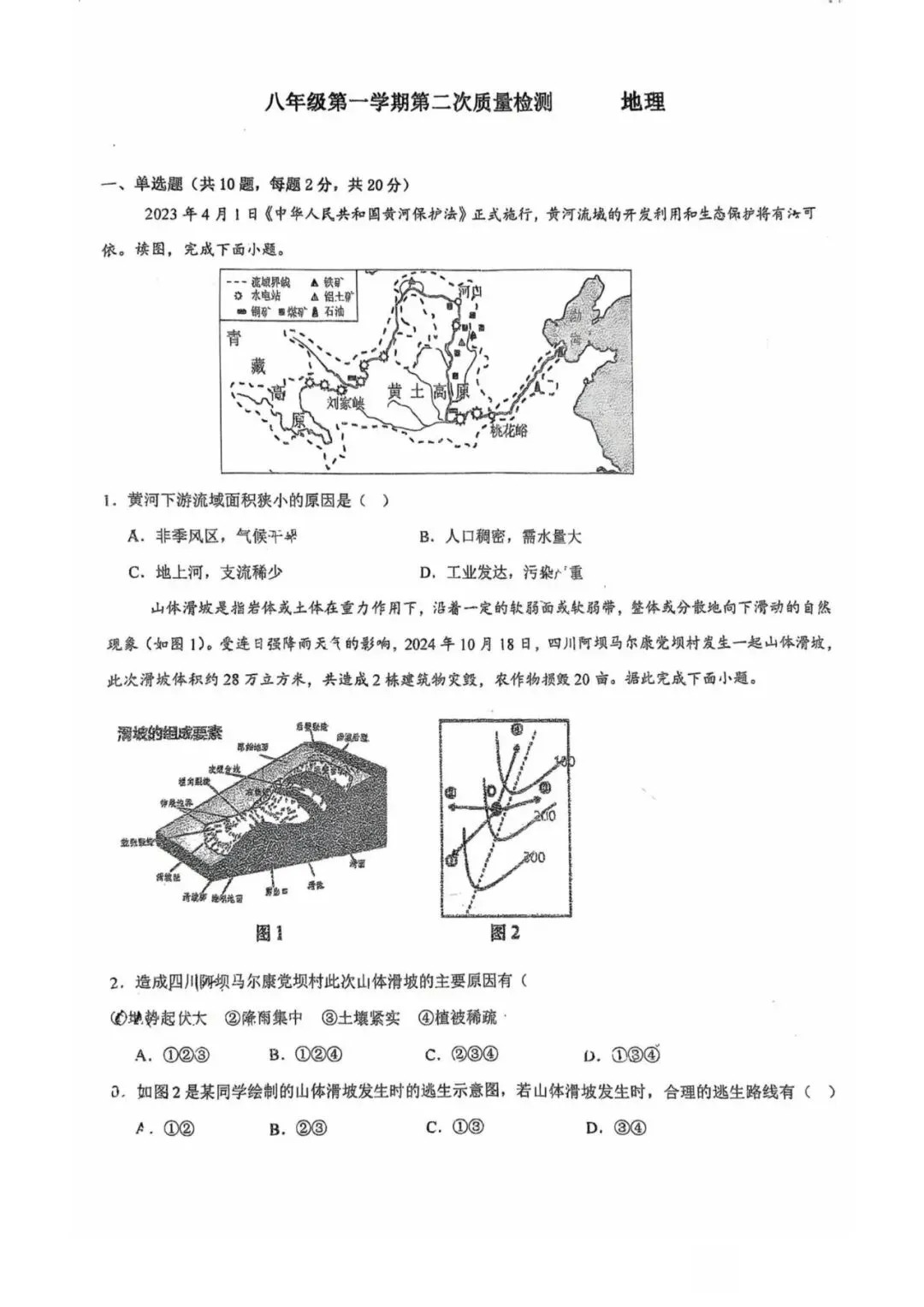 本卷突出地理学科区域性与综合性,选择题以黄河治理、山体滑坡、土地资源、西气东输、水资源分布、盐场布局、海洋资源、钢铁产业等多元主题考查基础概念理解,非选择题通过工业分布、育种基地等综合题考查知识应用能力。难点在于第2题山体滑坡成因分析需掌握地质灾害原理,第6题水资源时空分布要求理解气候特征,对空间思维能力要求较高;第8题南北盐场差异考查自然因素影响,第10题废钢循环涉及可持续发展。易得分题多为直接读图判断题,但整体通过真实情境题显著提升应用价值,符合八年级地理1月月考的素养要求。