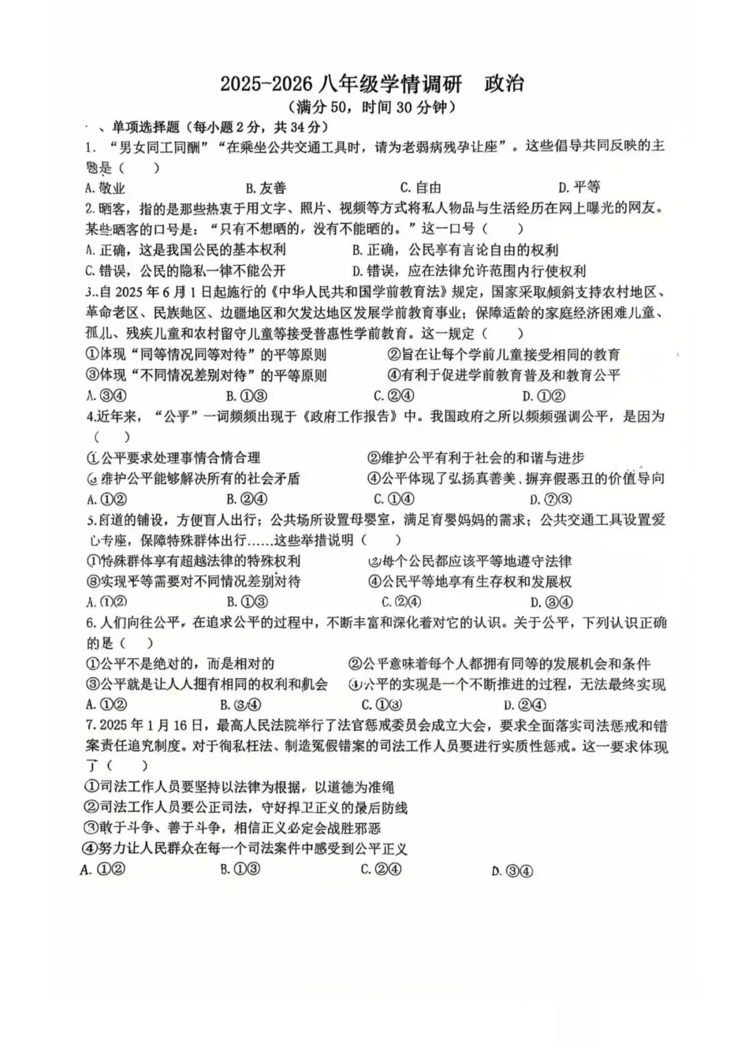 本卷突出道德与法治学科的思想性与实践性,选择题以平等原则、隐私保护、学前教育公平、司法正义等生活化情境考查价值判断能力,非选择题通过AI侵权案例分析、志愿服务调查等综合题考查知识应用能力。难点在于第6题公平相对性需掌握辩证思维,第12题国家利益关系图要求理解集体主义,对价值辨析能力要求较高;第15题信息安全涉及国家安全观,第18题自由界限考查法治意识。易得分题多为直接情境判断题,但整体通过真实案例题显著提升应用价值,符合八年级道德与法治1月月考的素养要求。