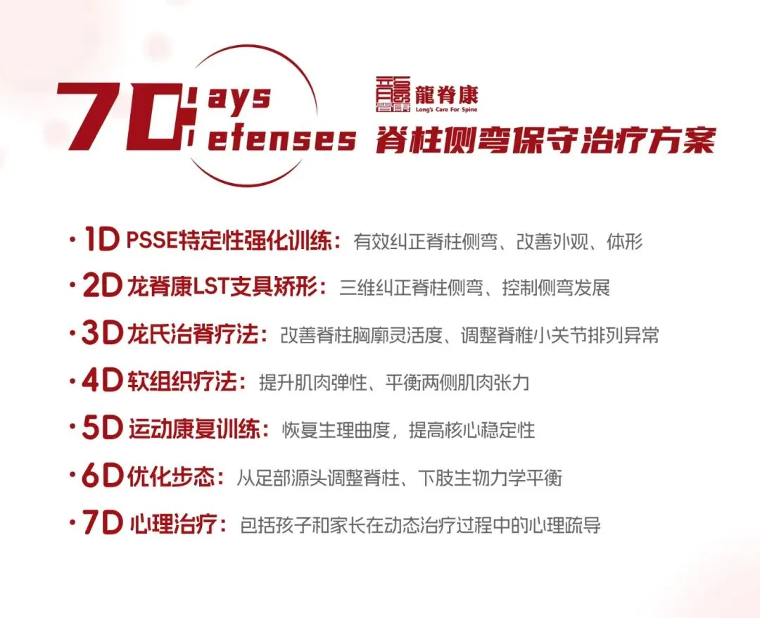 龙脊康深耕脊柱侧弯诊疗13年,接诊患者超30,000例,推出全模块7D Therapy®课程,直击行业五大痛点,打造系统性解决方案: