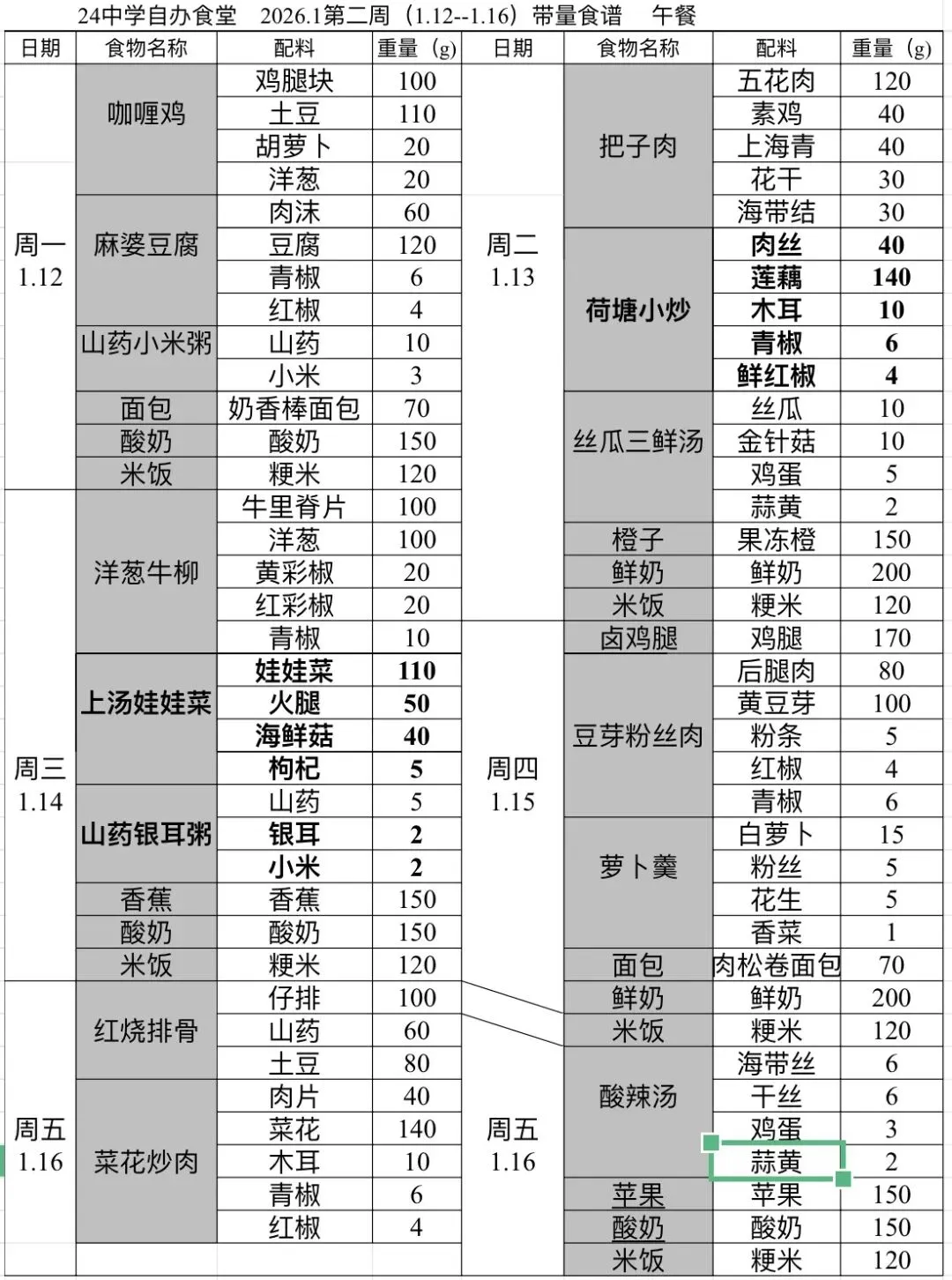 徐州市第二十四中学2026年1月第2周自办食堂带量食谱公示