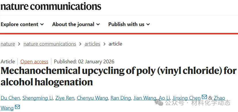 2026年1月2日,苏州大学王召、陈金星在国际知名期刊Nature Communications发表题为《Mechanochemical upcycling of poly (vinyl chloride) for alcohol halogenation》的研究论文,Du Chen为论文第一作者,王召、陈金星为论文共同通讯作者。