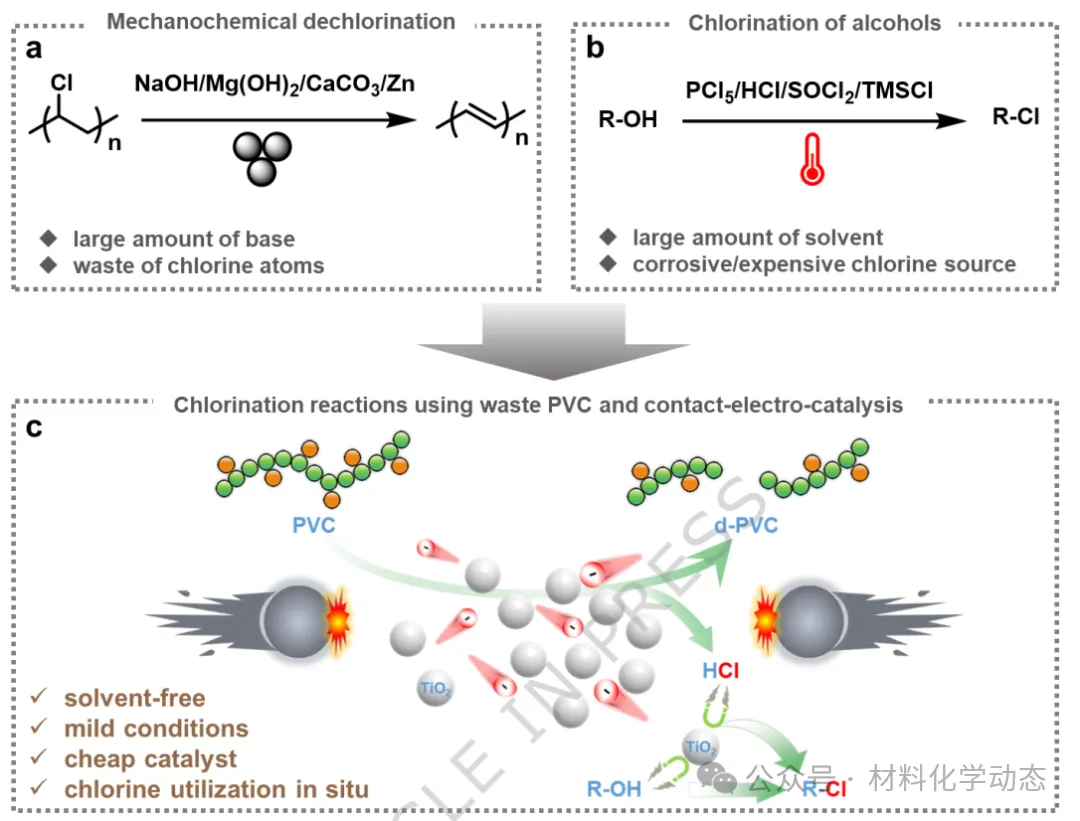 在此,作者提出一种串联机械化学反应策略,该策略以商用锐钛矿型二氧化钛(TiO2-A)作为接触电催化剂,在促进PVC脱氯的同时活化醇类物质,进而推动级联氯化反应的进行。与碱介导的PVC脱氯方法相比,作者的策略能够将氯元素转化为高附加值的有机氯化物,实现氯元素的资源化利用。