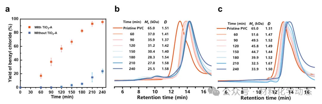 图2:苯甲醇氯化反应及不同研磨时间下聚氯乙烯(PVC)的降解。a)有无二氧化钛-A(TiO2-A)存在时氯化苄的产率。带误差棒的数据为三次独立实验的平均值±标准误。b)以聚甲基丙烯酸甲酯(PMMA)为标样,在四氢呋喃(THF)中对二氧化钛-A(TiO2-A)存在下的降解聚氯乙烯(d-PVC)进行的凝胶渗透色谱(GPC)分析。c)以聚甲基丙烯酸甲酯(PMMA)为标样,在四氢呋喃(THF)中对无二氧化钛-A(TiO2-A)存在下的降解聚氯乙烯(d-PVC)进行的凝胶渗透色谱(GPC)分析。