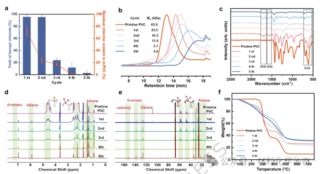 图4:聚氯乙烯(PVC)的循环再生实验。a)各循环后氯化苄的产率及降解聚氯乙烯(d-PVC)中的残余氯含量。带误差棒的数据为三次独立实验的平均值±标准误。b)以聚甲基丙烯酸甲酯(PMMA)为标样,在四氢呋喃(THF)中对原始PVC及不同循环次数后d-PVC的凝胶渗透色谱(GPC)分析。c)原始PVC及不同循环次数后d-PVC的傅里叶变换红外光谱(FT-IR)曲线。d)在氘代四氢呋喃(THF-d8)中原始PVC及不同循环次数后d-PVC的氢核磁共振(1H NMR)谱;e)碳核磁共振(13C NMR)谱。f)原始PVC及各循环后d-PVC的热重分析(TGA)曲线。