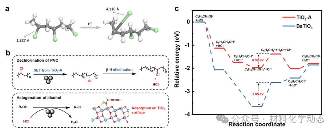 图6:机理研究。a)聚氯乙烯(PVC)脱氯及苯甲醇氯化反应的可能机理。b)密度泛函理论(DFT)计算所得1,3,5-三氯己烷化合物中碳-氯键的断裂趋势。c)苯甲醇与氯化氢在二氧化钛-A(101)和钛酸钡(110)晶面表面发生反应的能量曲线。