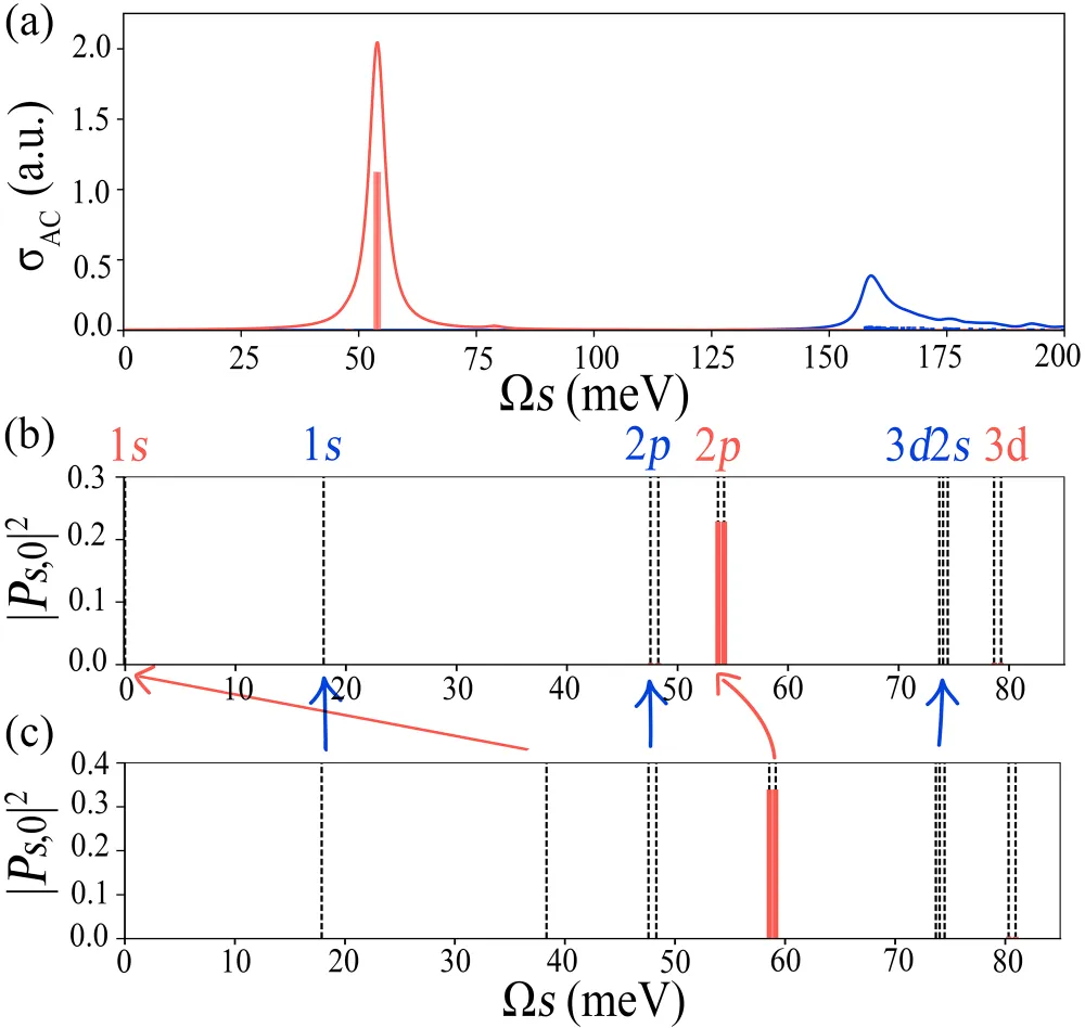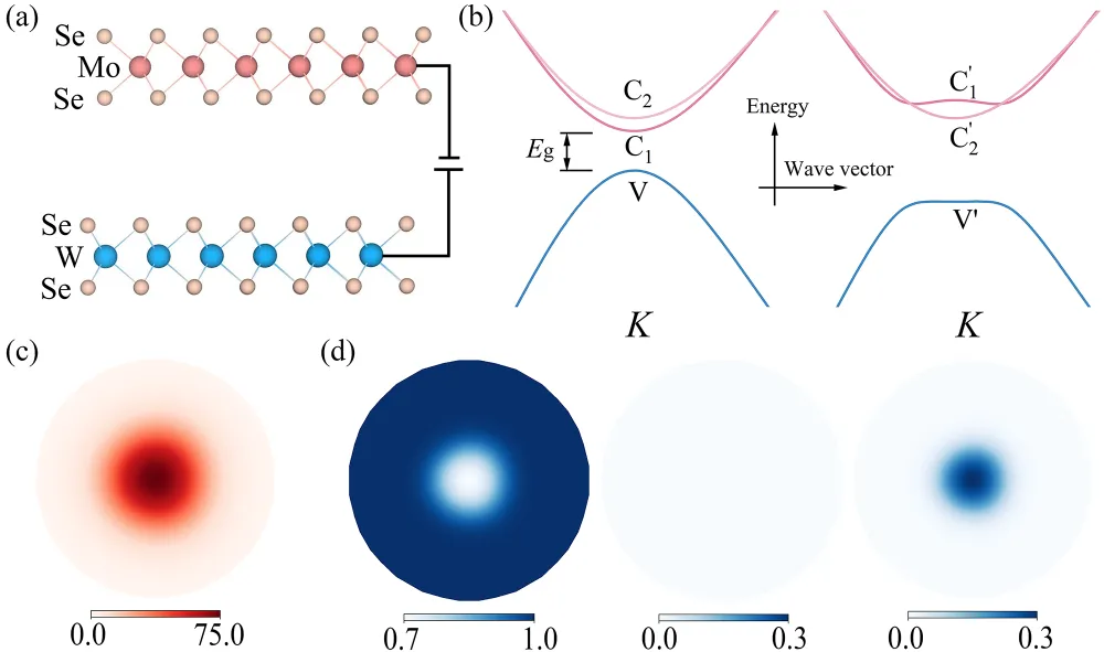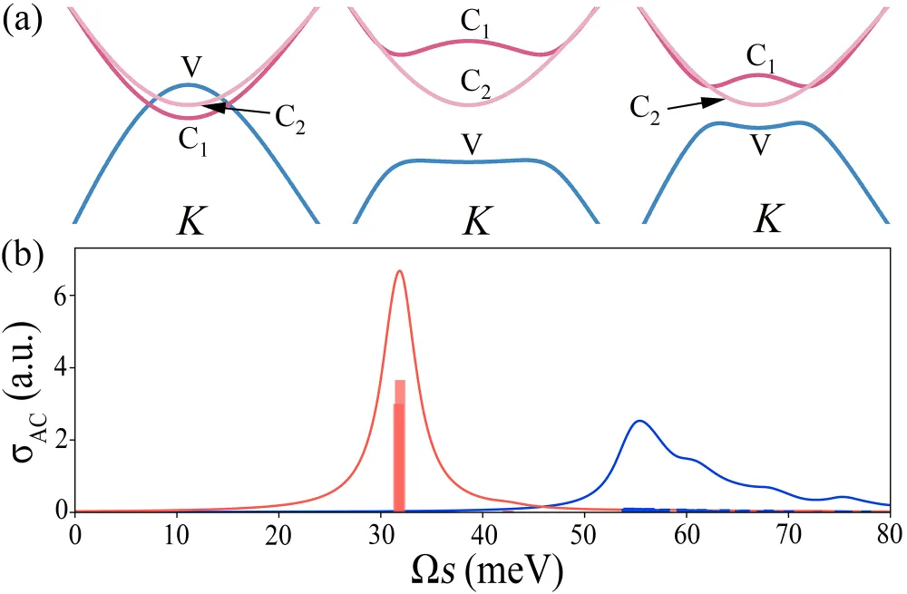 Fig 1: (a) 偏压调制WSe2-MoSe2双层体系的原子结构图。(b) 正常态能带(左)和BEC区间的EI态能带(右),计算中我们仅考虑1条价带和2条导带,命名为vc1c2。(c) 动量空间序参量分布图|∆vc1k|(meV)。(d) 准粒子变换U矩阵元动量空间分布:|Uvvk|2, |Uvc2k|2, |Uvc1k|2。Fig 2: 偏压调制WSe2-MoSe2双层体系BEC区间沿armchair(AC)方向的光导率。红色与蓝色曲线分别是BSE和IPA计算结果,并采用2 meV的洛伦兹展宽。(b) BSE计算所得激发谱,激发态可以分为c1和c2类型,分别由v → c1和v → c2的准电子空穴跃迁主导,用红色与蓝色表示。(c) 与(b)相同,但基于Tamm-Dancoff approximation计算。Fig 3: 图2中所示的若干c1型集体激发态与相应序参量涨落的动量空间分布。Fig 4: (a) 偏压调制WSe2-MoSe2双层体系的BCS激子绝缘体区间。图中展示了正常态(左)、正常态介电屏蔽下的EI态(中)以及激子绝缘态介电屏蔽下的EI态(右)的能带结构。(b) 沿AC方向的光导率。红色与蓝色曲线分别是基于BSE和IPA的计算结果,并采用2 meV的洛伦兹展宽。Fig 5: (a) 描述e-h传播子的费曼图。两条入射线可视为玻色子,该图也可理解为玻色场传播子的自能。黑色实线表示电子传播子:若体系处于对称性破缺相,则需通过平均场进行修正。蓝色波浪线代表带间相互作用,蓝色虚线表示相同作用,在对角化后的准粒子能带基矢中分解为e-h通道与anti-e-h通道。(b) 玻色场传播子的集体激发模式表示。第一行为用原始带间相互作用表达的玻色场传播子,集体激发模式包含在顶点中。第二行为Hubbard-Stratonovich变换后的等效图,其中蓝色虚线表示传递相互作用的玻色场传播子。原文链接:https://journals.aps.org/prb/abstract/10.1103/rdrs-ndjc
