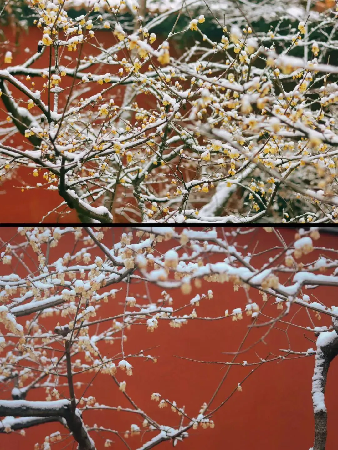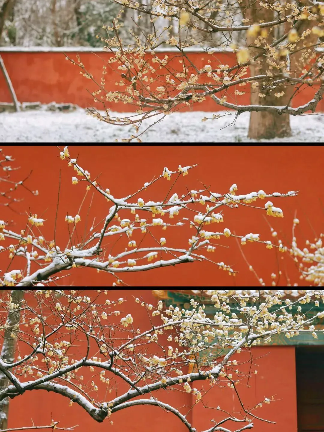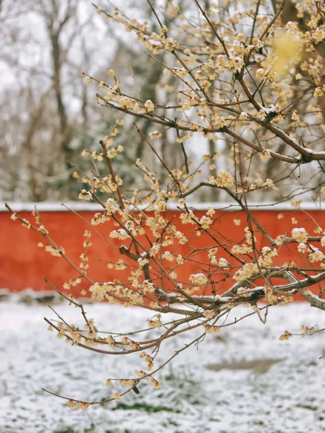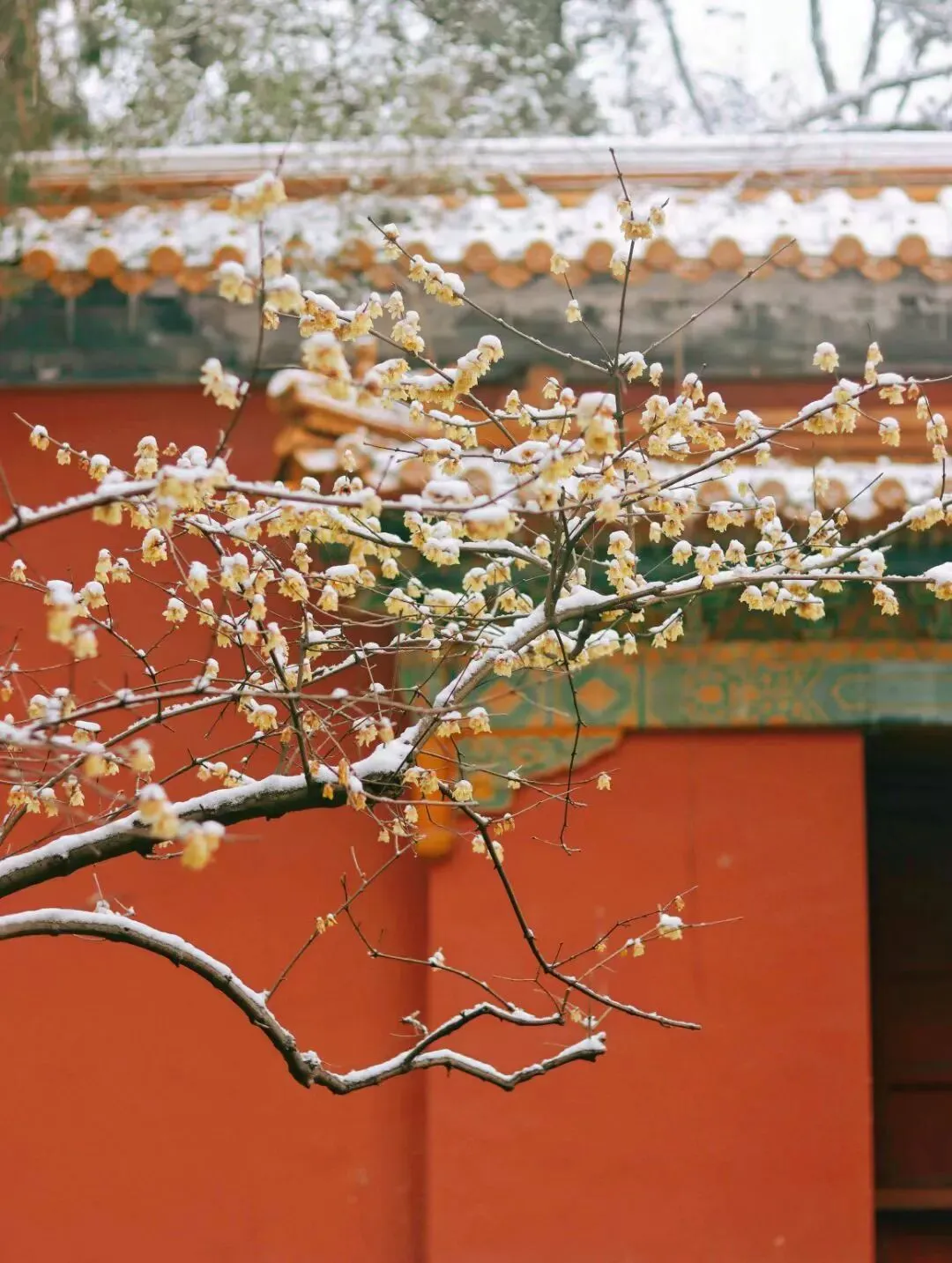 朱红的墙与腊梅相映,