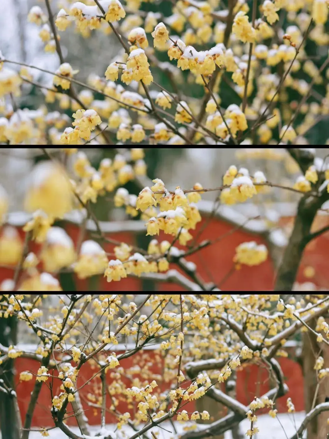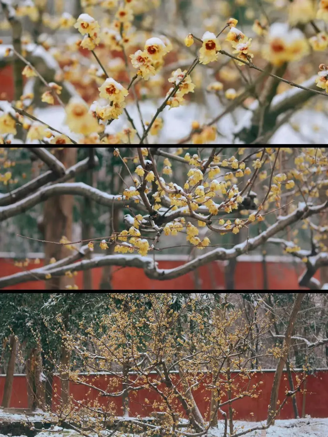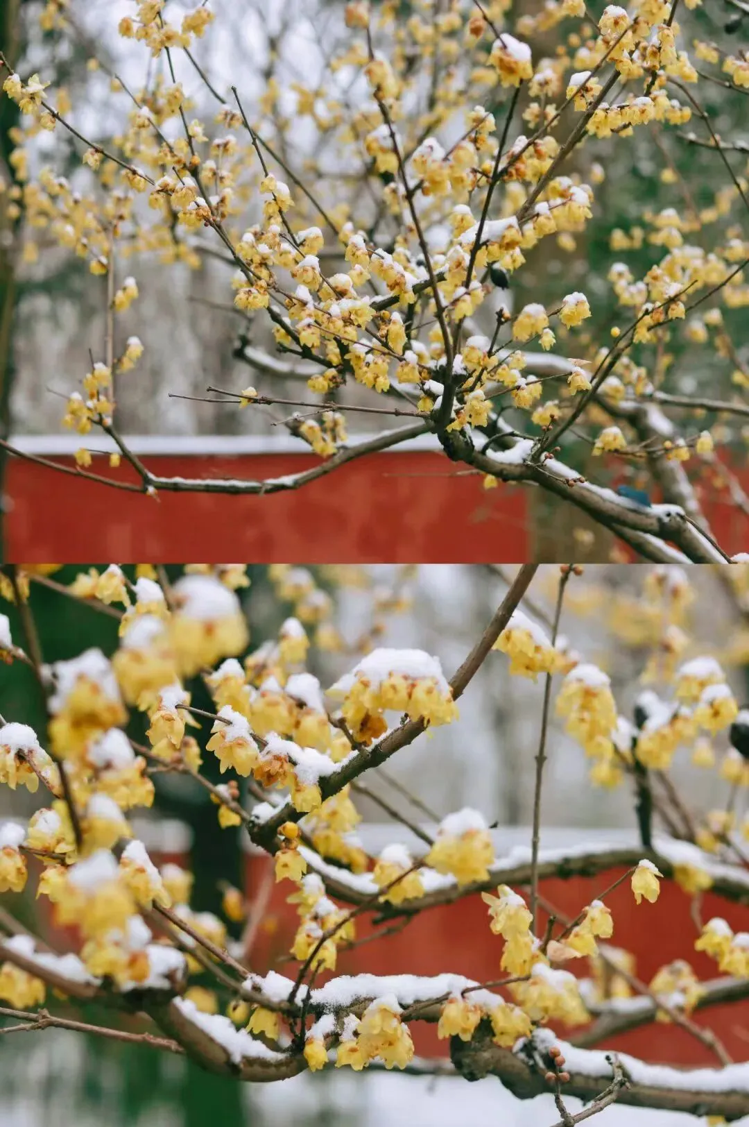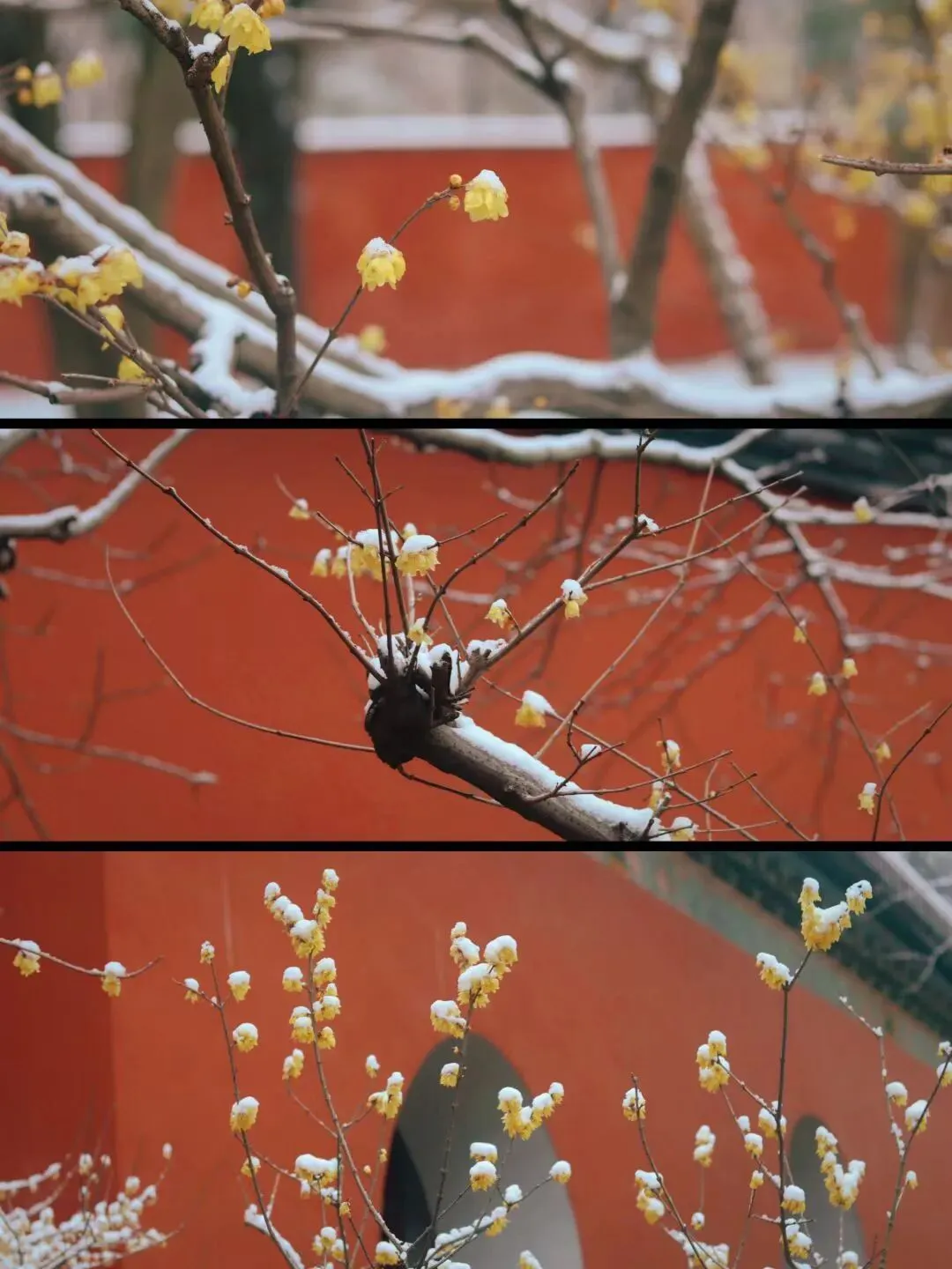 朱红的墙与腊梅相映,