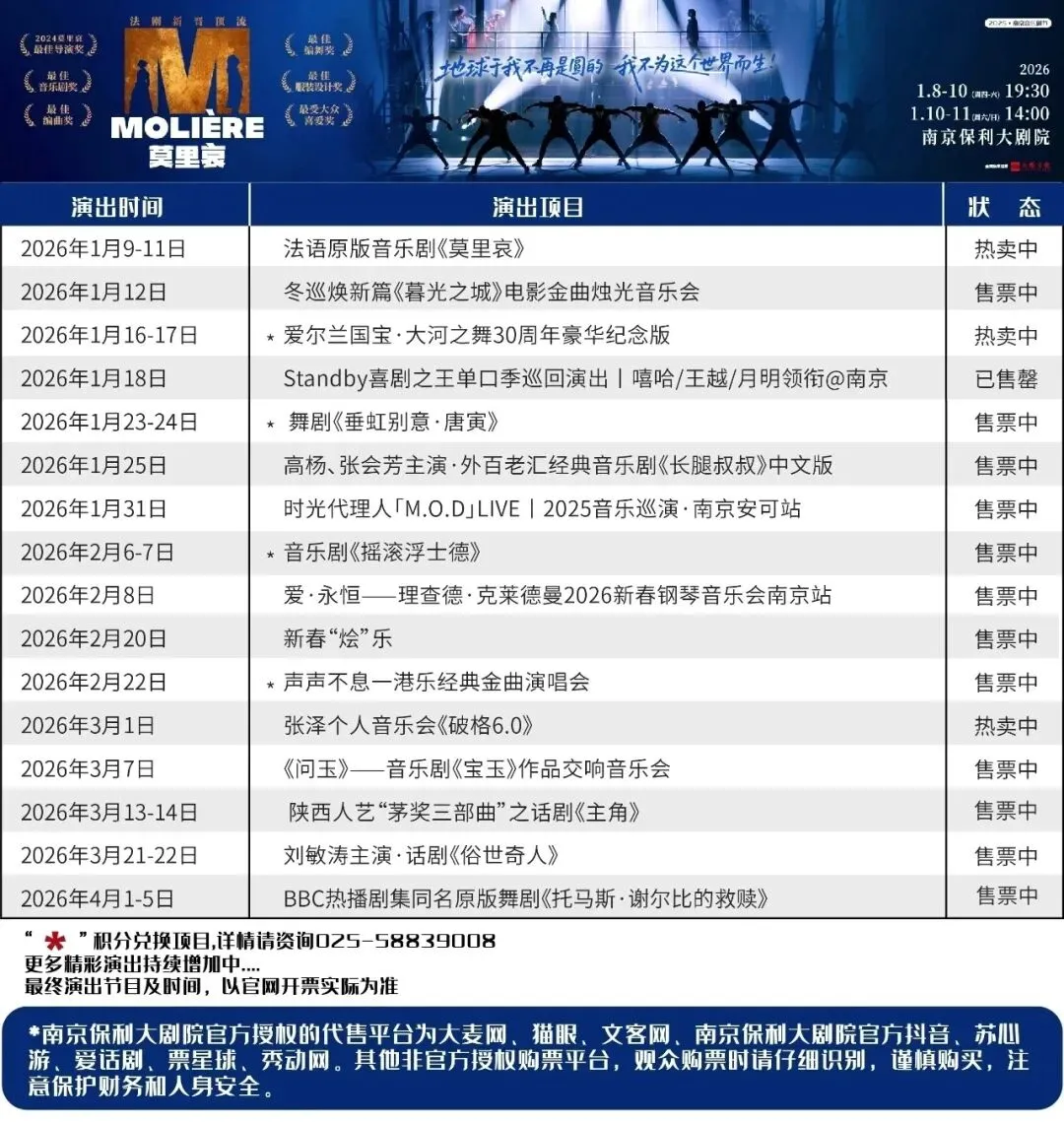 3.本场演出参与会员积分兑换,限南京保利大剧院售票厅办理;