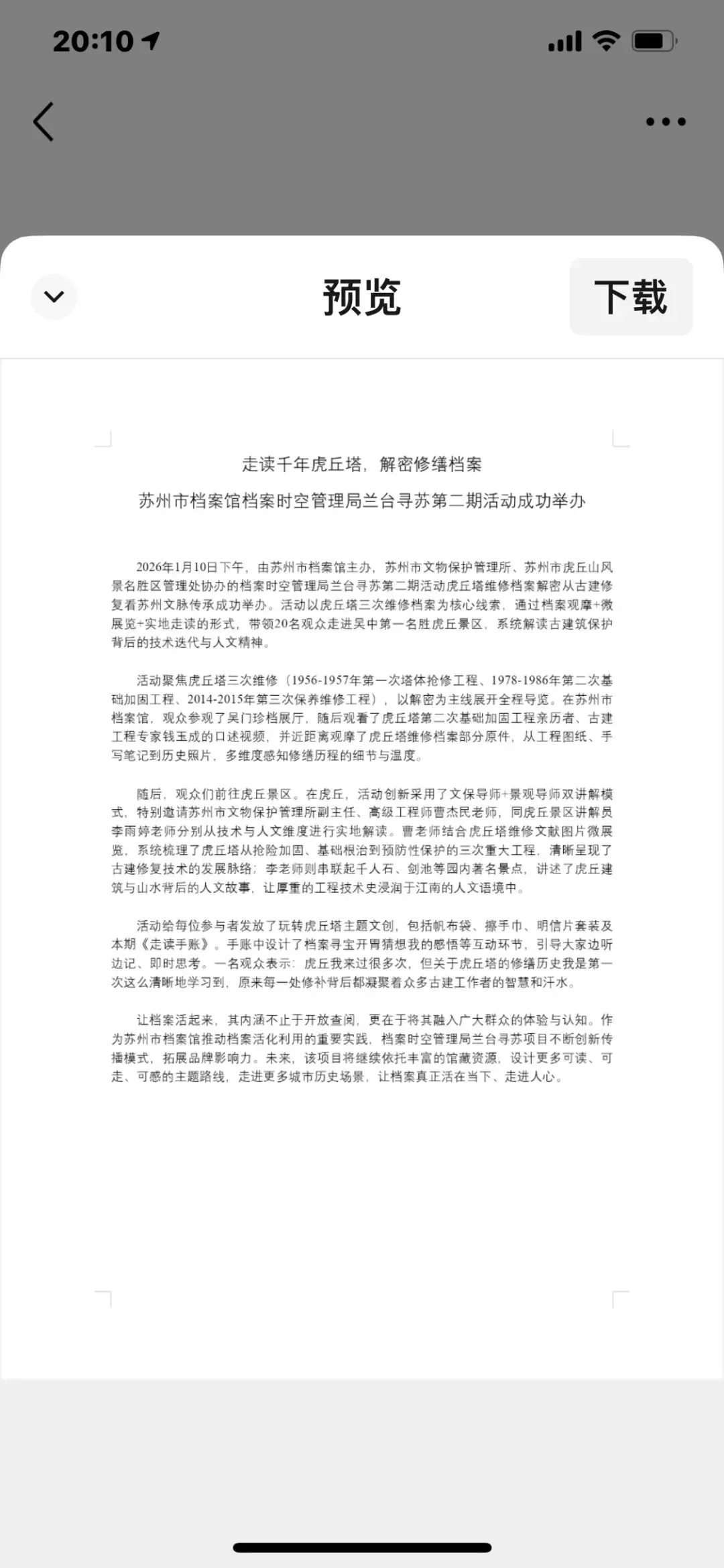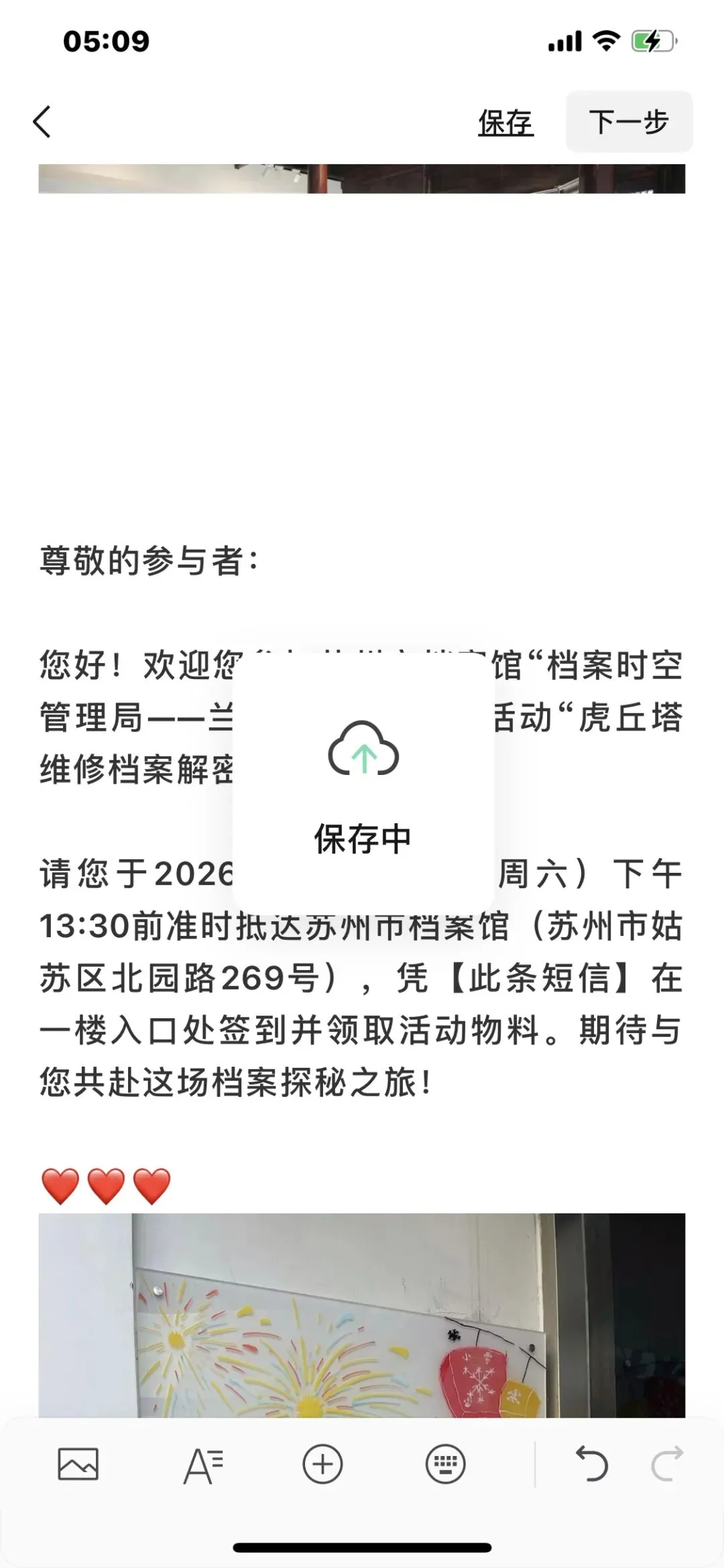尊敬的参与者:您好!欢迎您参加苏州市档案馆“档案时空管理局——兰台寻苏”第二期活动“虎丘塔维修档案解密”。请您于2026年1月10日(本周六)下午13:30前准时抵达苏州市档案馆(苏州市姑苏区北园路269号),凭【此条短信】在一楼入口处签到并领取活动物料。期待与您共赴这场档案探秘之旅!