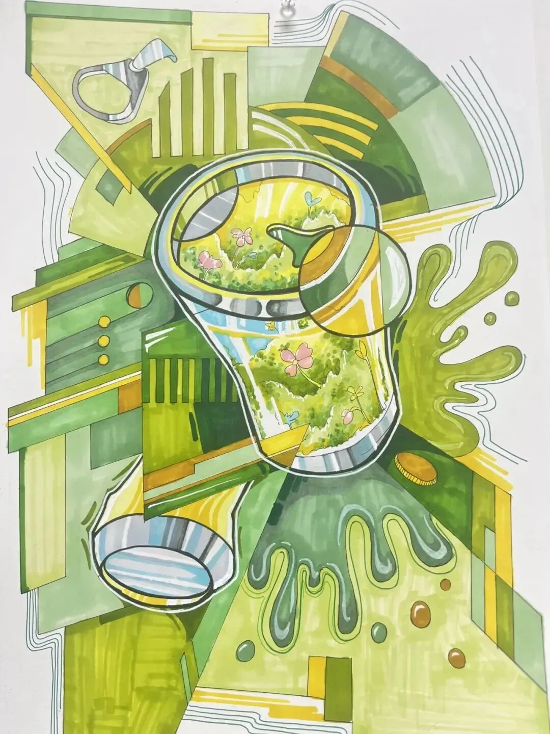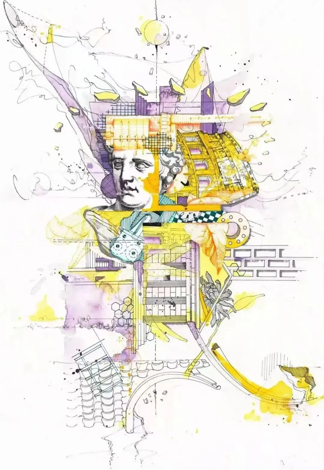 1.考查考生设计思维与色彩表现能力,要求考生根据考场提供抽象与具象相结合的图片,作品视觉效果应体现强烈的形式感与趣味性;材料与技法表现可多形式,描绘技法不限;