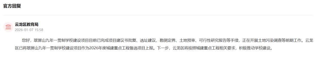 对此,云龙区教育部门表示:翠屏山九年一贯制学校建设项目目前已完成项目建议书批复、选址建议、勘测定界、土地预审、可行性研究报告等手续,正在开展土地污染调查等前期工作。