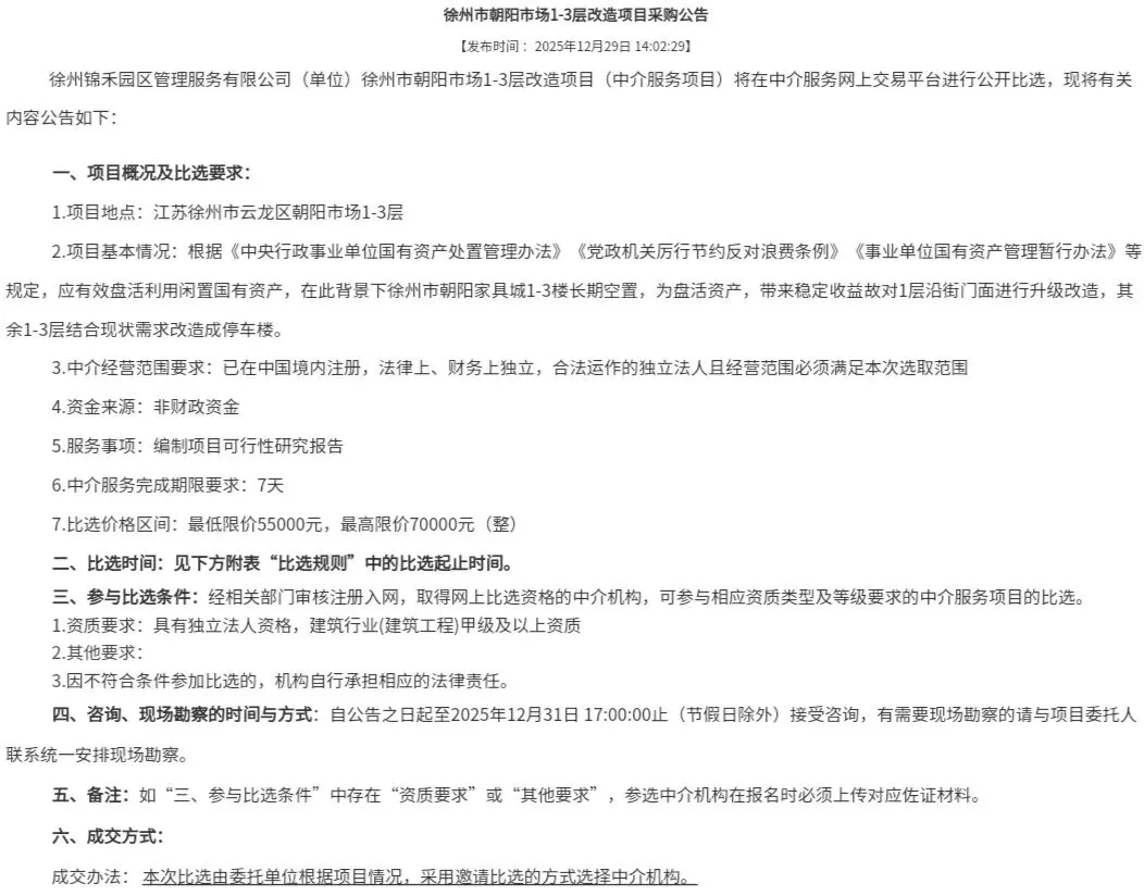 朝阳市场家具城计划启动改造,改造项目可行性研究报告采购公告已发布,拟对朝阳家具城一层沿街店铺进行升级改造,其余1-3层结合现状需求改造成停车楼。