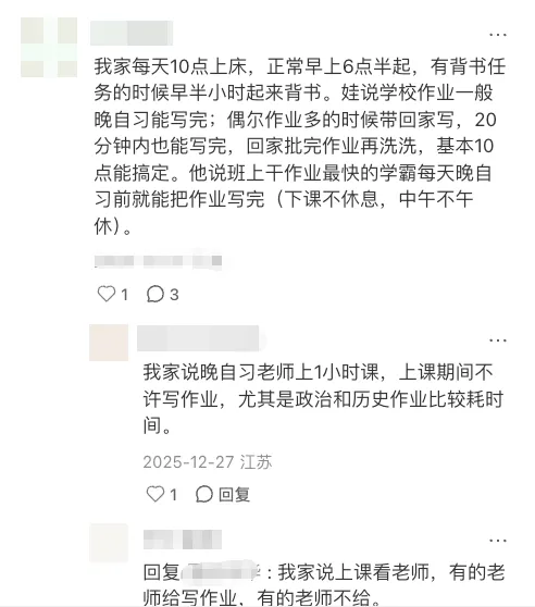 同时也有网友还提及晚自习的相关情况,如8点半下课,到家近9点,部分老师会在晚自习上课1小时且不许写作业,还有政治和历史作业耗时。