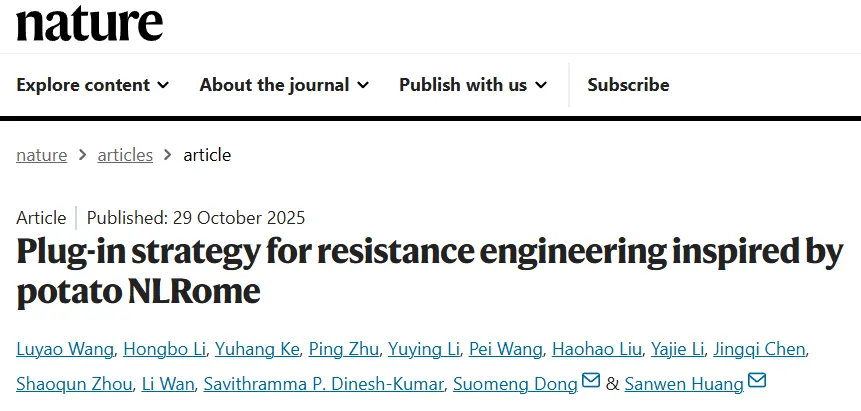 2025年10月29日,南京农业大学农林生物安全全国重点实验室/植物保护学院董莎萌教授课题组联合中国农业科学院深圳农业基因组研究所黄三文团队在《自然》(Nature)期刊发表了题为“Plug-in Strategy for Resistance Engineering Inspired by Potato NLRome”的研究论文,为解决马铃薯晚疫病这一全球性难题提供了一个新方案。