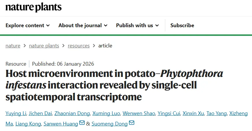 2026年1月6日,南京农业大学植物保护学院/农林生物安全全国重点实验室董莎萌课题组与中国农业科学院深圳农业基因组研究所(岭南现代农业科学与技术广东省实验室深圳分中心)黄三文团队合作,在《自然·植物(Nature Plants)》上在线发表了题为“Host Microenvironment in Potato-Phytophthora infestans Interaction Revealed by Single-cell Spatiotemporal Transcriptome”的研究论文。该研究利用Stereo-seq空间转录组技术,在单细胞分辨率下解析了马铃薯叶片与晚疫病菌互作的宿主微环境动态变化,鉴定出晚疫病病程中的两类关键的寄主细胞类型:病原靶向细胞(PTCs)与周质细胞(SPCs),揭示了其分别在免疫响应中的功能特点,提出了晚疫病病程新模型。