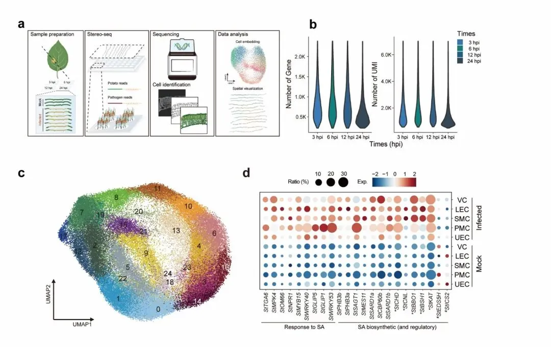 研究团队通过对接种(3、6、12、24小时)晚疫病菌的马铃薯叶片进行空间转录组分析,成功获得了73,271个高质量单细胞数据。通过整合细胞形态标记(如细胞壁染色)和基因表达谱,鉴定了叶片中的主要细胞类型,包括上下表皮细胞、栅栏组织细胞、海绵组织细胞和维管相关细胞,并揭示了不同细胞类型响应病原菌的异质性和统一性(图1)。