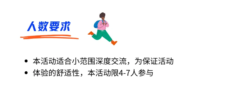 2.人数:本次活动限4-18人,参与需要提前至少一天报名;