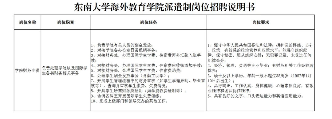 具体岗位任务和岗位要求详见《东南大学海外教育学院派遣制岗位说明书》