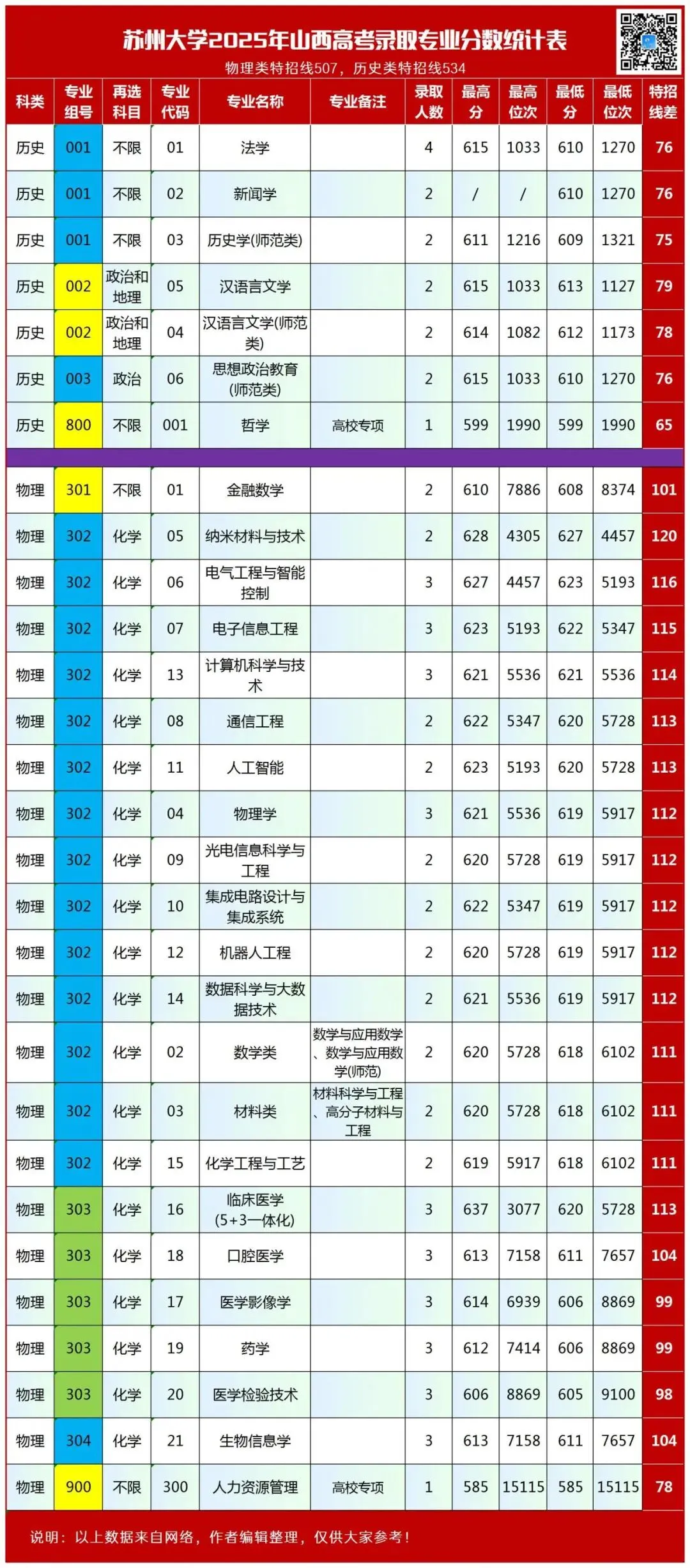 以下为苏州大学2025年山西录取分数及位次统计表: