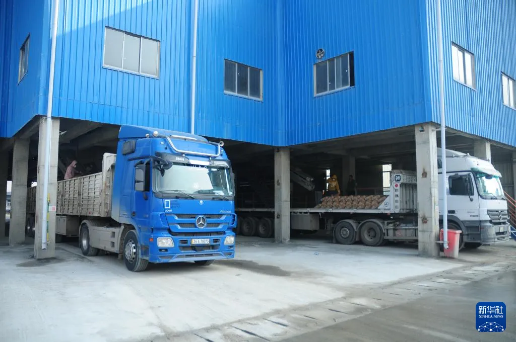 12月26日,在伊拉克北部库尔德自治区苏莱曼尼亚市城郊的伊拉克德尔塔水泥厂,工作人员向卡车上搬运水泥成品。新华社记者 段敏夫 摄