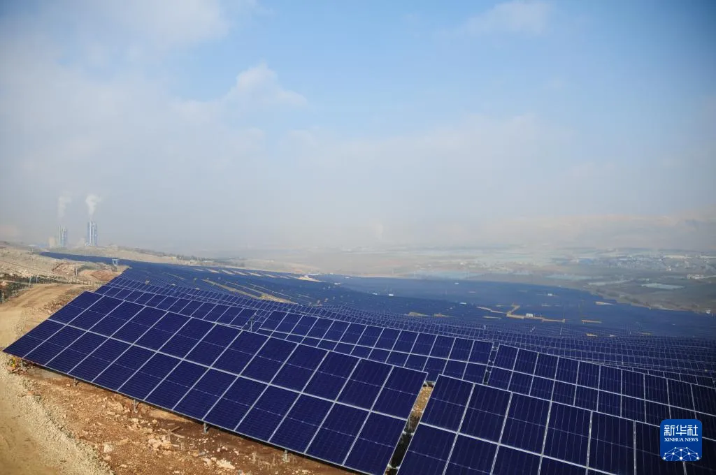 这是12月26日在伊拉克北部库尔德自治区苏莱曼尼亚市城郊拍摄的伊拉克德尔塔水泥厂的光伏电站。新华社记者 段敏夫 摄