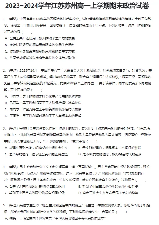 2019-2024学年苏州各区高一上学期期末史地政生真题及答案解析