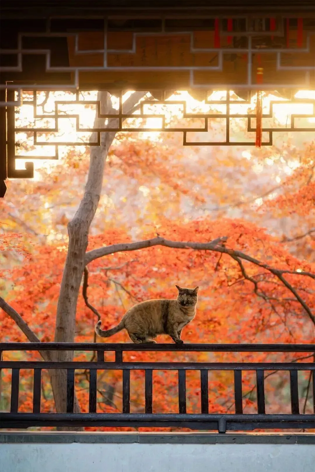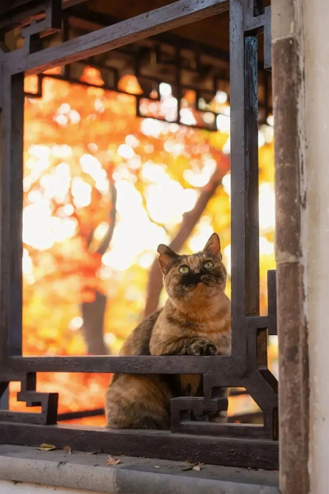 以花窗为画框,焦点对准猫,虚化前景窗棂。一实一虚,一古一灵,故事感拉满。文案可以配:“它思考的‘猫生’,比我的周报深邃。”