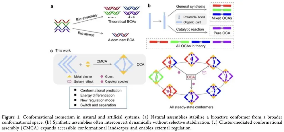 图一:天然与人工体系的构象异构示意图。(a)天然组装体从广阔构象空间中稳定生物活性构象;(b)合成组装体常动态互变,无选择性稳定;(c)簇介导构象组装(CMCA)拓展可及构象图景,实现外部调控。