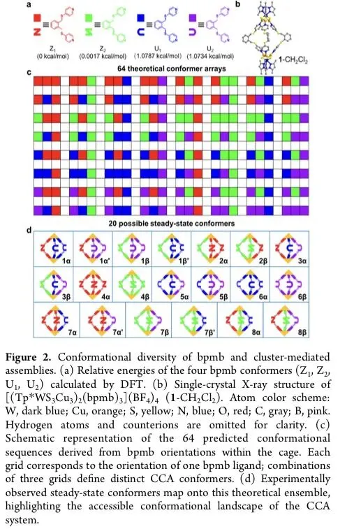 图二:bpmb配体与簇介导组装体的构象多样性。(a)DFT计算的四种bpmb构象(Z₁、Z₂、U₁、U₂)相对能量;(b)(Tp*WS₃Cu₃)₂(bpmb)₃₄(1-CH₂Cl₂)的单晶X射线结构,原子颜色方案:W(深蓝色)、Cu(橙色)、S(黄色)、N(蓝色)、O(红色)、C(灰色)、B(粉色),省略氢原子和反离子;(c)64种预测构象序列的示意图,每个网格对应一个bpmb配体的取向,三个网格的组合定义不同CCA构象;(d)实验观察到的稳态构象映射到理论集合,凸显CCA体系的可及构象图景。