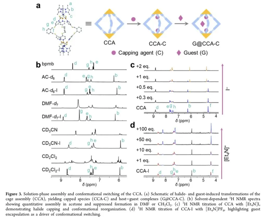 图三:CCA的溶液相组装与构象转换。(a)卤化物和客体诱导的笼状组装体(CCA)转化示意图,生成封端物种(CCA-C)和主-客体复合物(G@CCA-C);(b)溶剂依赖性¹H NMR光谱,显示在丙酮中定量组装,在DMF或CH₂Cl₂中组装受抑制;(c)CCA与[Et₄N]I的¹H NMR滴定,表明卤化物封端和构象重组;(d)CCA-I与[Et₄N]PF₆的¹H NMR滴定,凸显客体封装作为构象转换的驱动力。