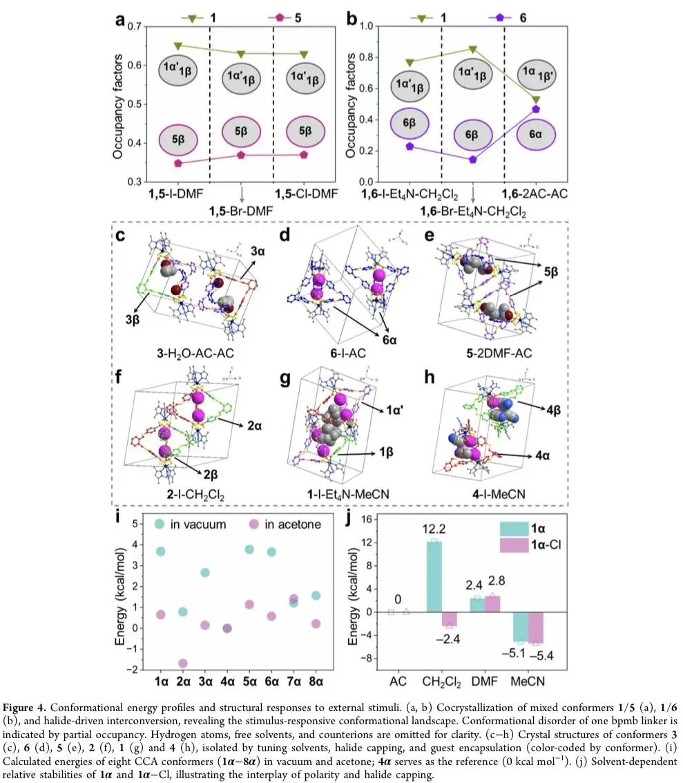 图四:构象能量曲线与外部刺激的结构响应。(a、b)混合构象1/5(a)、1/6(b)的共结晶及卤化物驱动的互变,揭示刺激响应构象图景,一个bpmb配体的构象无序以部分占有率表示,省略氢原子、游离溶剂和反离子;(c-h)通过调控溶剂、卤化物封端和客体封装分离得到的构象3(c)、6(d)、5(e)、2(f)、1(g)和4(h)的晶体结构(按构象颜色编码);(i)8种CCA构象在真空和丙酮中的计算能量,以4α为参考(0 kcal·mol⁻¹);(j)1α和1α-Cl在不同溶剂中的相对稳定性,阐明极性与卤化物封端的相互作用。