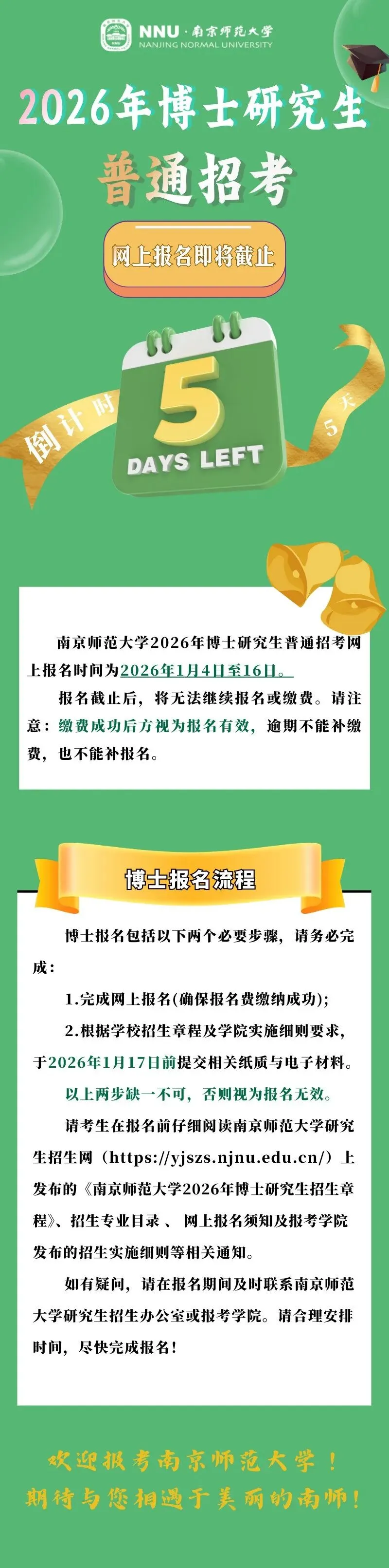 >倒计时5天!南京师范大学2026年博士研究生招生普通招考网上报名将于本周五截止