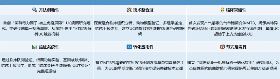 Significance and Innovations 这项研究首次将Aeromonas sp. MTB及其气溶素毒素确立为UC发病的关键环境因子,揭示了“微生物-巨噬细胞-上皮屏障”的破坏轴心。不仅深化了对UC起源的理解,还提出了从诊断(检测MTB或气溶素)到治疗(抗体中和)的转化路径。未来,针对气溶素的策略或可弥补当前免疫抑制疗法的不足,为UC患者带来新希望。