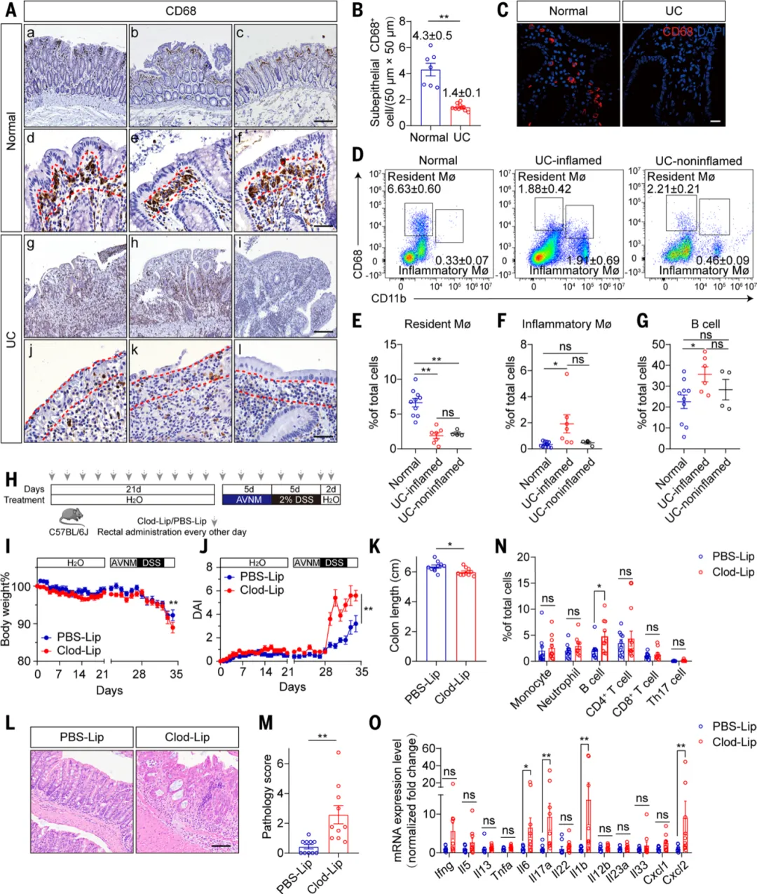 结果发现,尽管巨噬细胞耗竭本身不引发自发结肠炎,但会使小鼠对低剂量葡聚糖硫酸钠(DSS)的损伤异常敏感,导致更严重的体重下降、结肠缩短和炎症细胞浸润(如B细胞增多和炎性因子上调)。这提示巨噬细胞屏障是抵御肠道刺激的关键防线,其缺失可能是UC的“导火索”【图1H-M】。