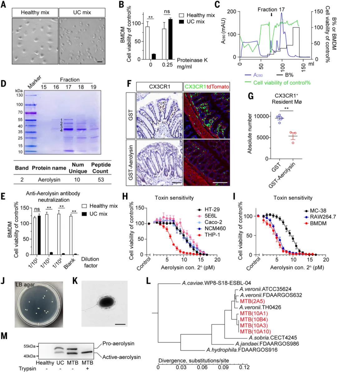 通过培养和基因测序,他们从UC患者粪便中成功分离出了产生这种气溶素的细菌,并将其命名为巨噬细胞毒性细菌(MTB)。系统发育分析表明,MTB是气单胞菌属的一个新变种,与已知的维氏气单胞菌亲缘关系最近但又截然不同【图2J-L】。