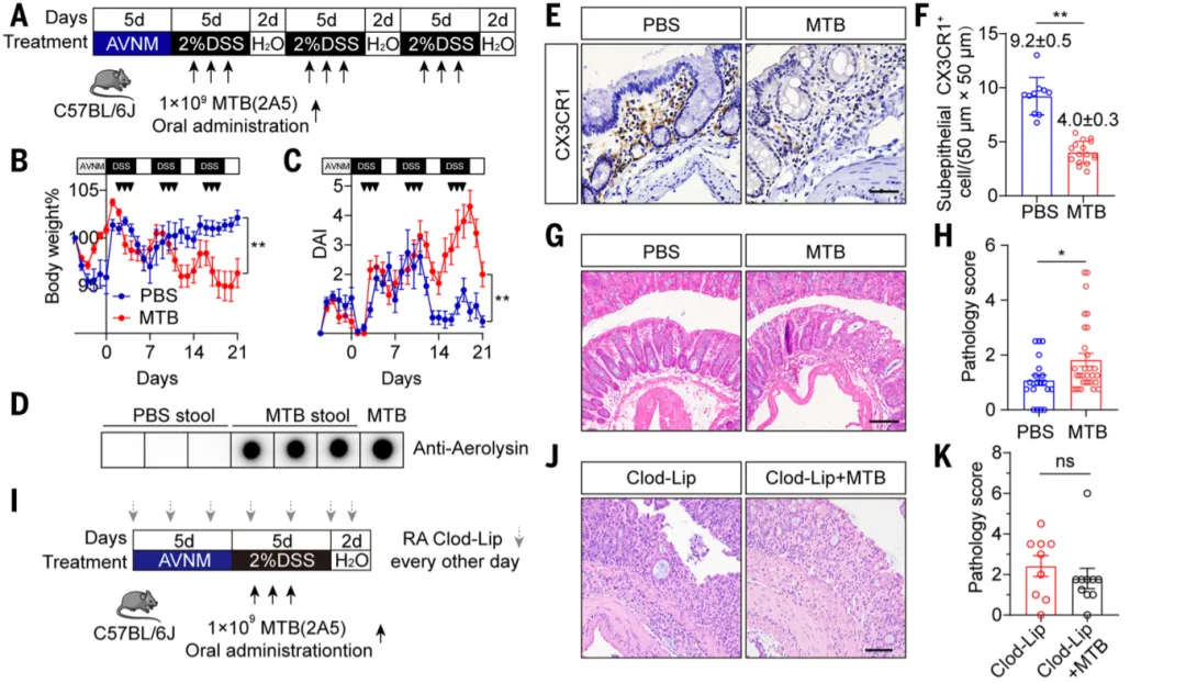 免疫组化显示,MTB处理的小鼠结肠上皮下的CX3CR1+巨噬细胞几乎消失,而对照组巨噬细胞排列整齐【图3E-F】。病理切片显示,MTB组结肠有大量炎症细胞浸润、隐窝扭曲、脓肿形成,病理评分显著高于对照组【图3G-H】。若预先用Clod-Lip耗竭巨噬细胞,MTB就无法加重DSS诱导的结肠炎,说明MTB正是通过破坏巨噬细胞防线来诱发炎症【图3I-K】。