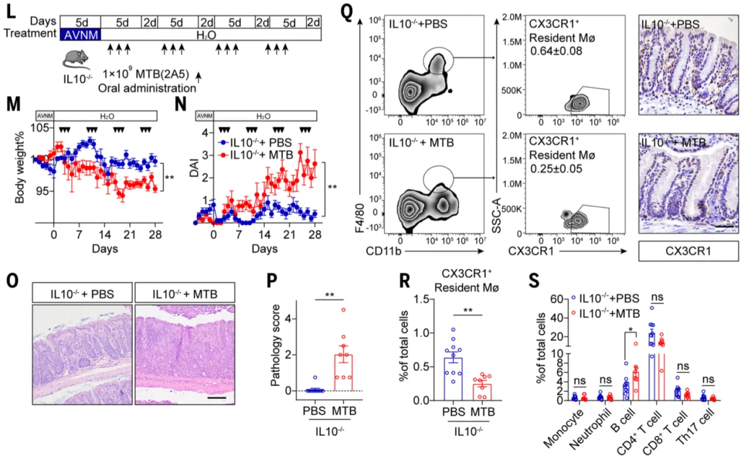 在IL-10敲除小鼠(易自发结肠炎模型)中,MTB同样加速了疾病进展,且这一过程不依赖DSS,凸显了MTB在遗传易感背景下的致病力。有趣的是,无菌小鼠中MTB不诱发结肠炎,表明其致病需要肠道菌群的协同作用【图3L-S】。