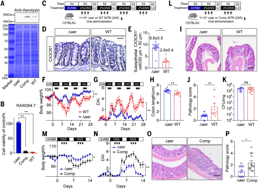 通过互补实验重新引入气溶素后,Δaer MTB恢复了诱发结肠炎的能力【图4L-P】。这充分证明:气溶素是MTB诱发UC的“致命武器”,没有它,MTB就无法破坏巨噬细胞防线。