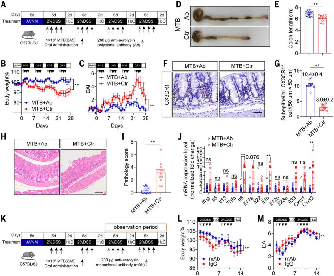 结果令人振奋:抗体处理的小鼠完全没有出现结肠炎症状,体重稳定,DAI评分正常,结肠长度正常,病理评分低,上皮下巨噬细胞完好无损,炎性细胞因子表达与对照组无异【图6A-J】。这说明抗气溶素抗体能有效预防MTB诱导的结肠炎。