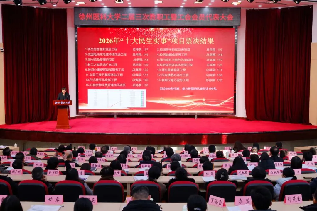 大会听取审议了《凝心聚力谋发展 深化改革谱新篇——在徐州医科大学二届三次教职工暨工会会员代表大会上的报告》《徐州医科大学“十五五”事业发展规划(草案)》及各专项规划(草案)、《徐州医科大学绩效工资实施办法(修订)(草案)》《学校财务报告》《教代会执委会及工会工作报告》《工会经费审查委员会工作报告》,书面审议了《提案工作报告》,票决通过2026年“十大民生实事”项目,审议通过《大会决议(草案)》,圆满完成各项议程。