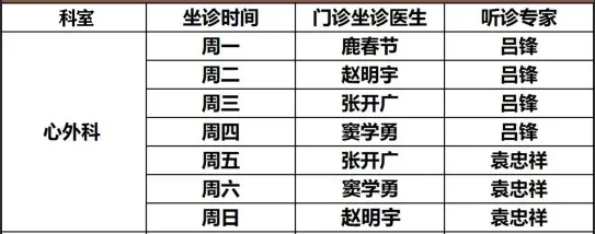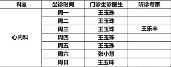 吕锋教授(心外科):周一8:30-10:00、王乐丰教授(心内科):周三8:30-10:00