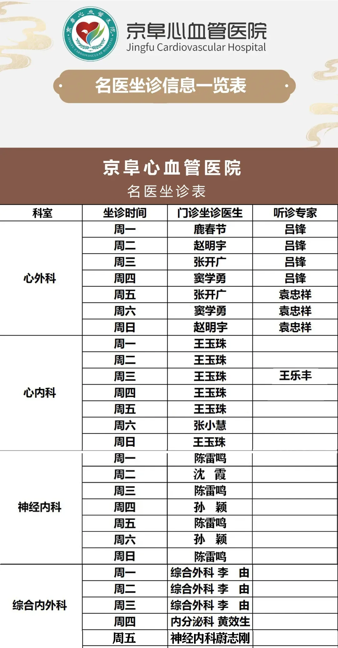 为方便广大居民的医疗服务需求,现将徐州京阜心血管医院专家一周坐诊排班表公布如下,有需求的患者及时收藏哦!